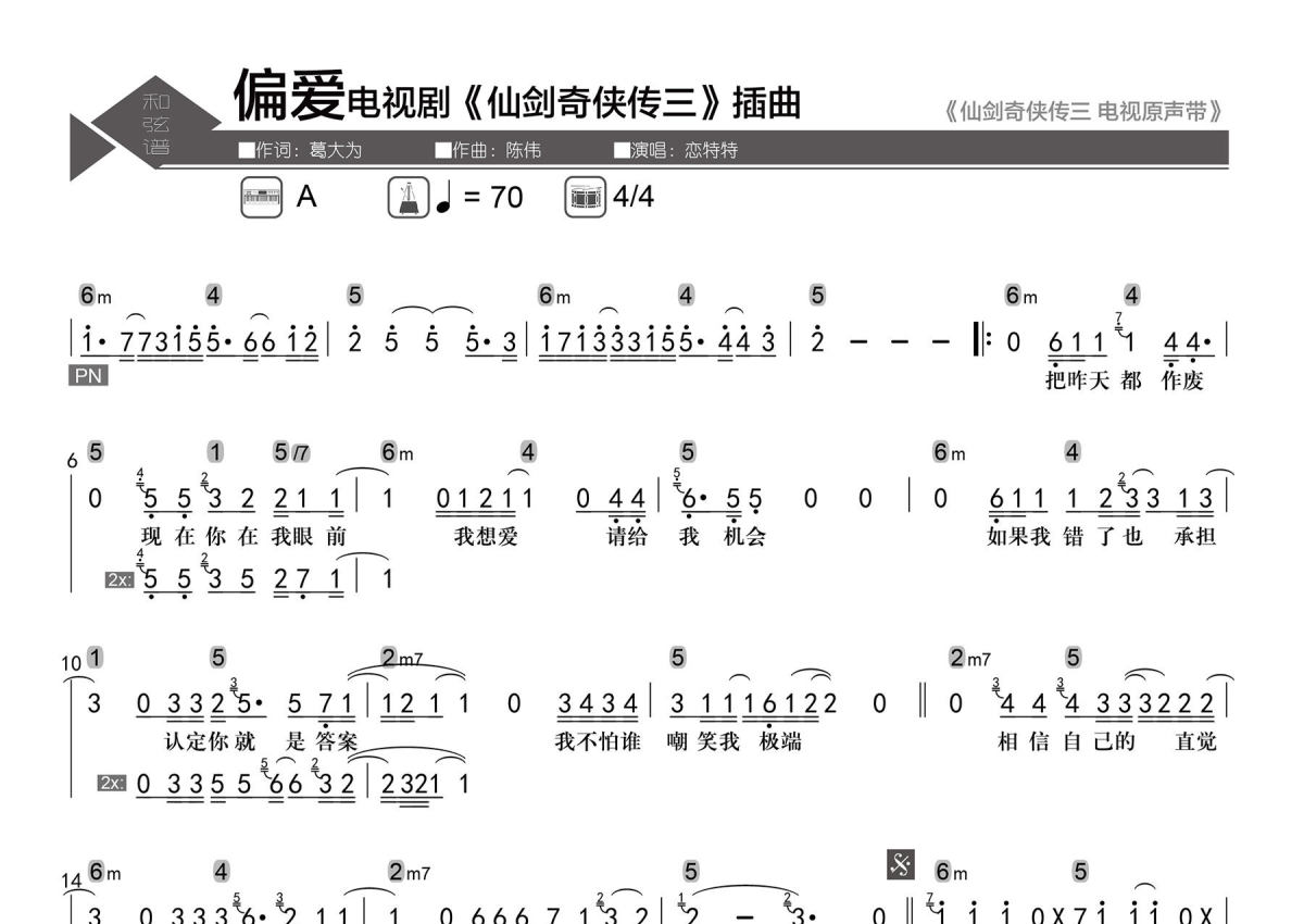 张芸京《偏爱》简谱 - 数字级数和弦谱