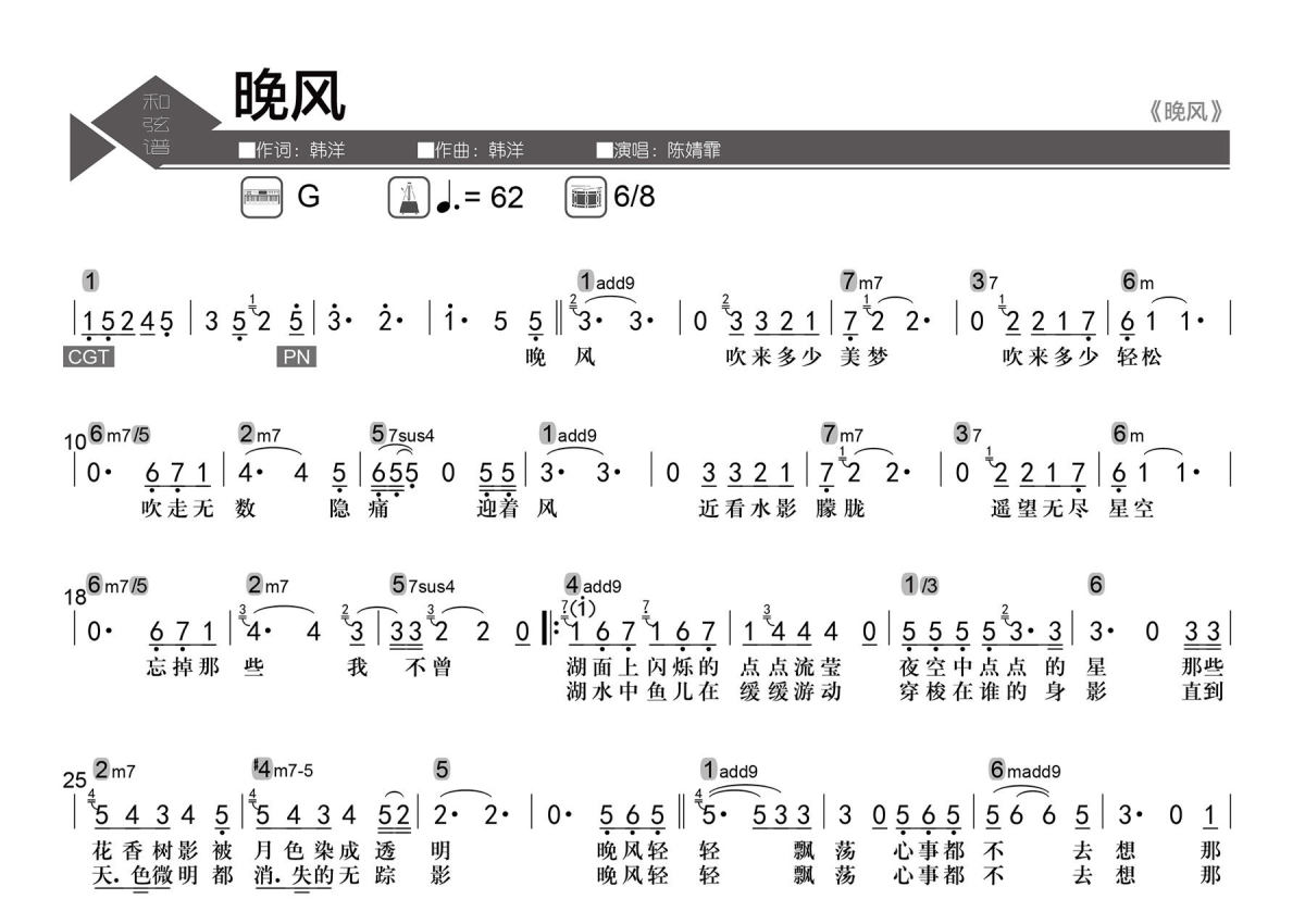 陈婧霏《晚风》简谱 - 数字级数和弦谱
