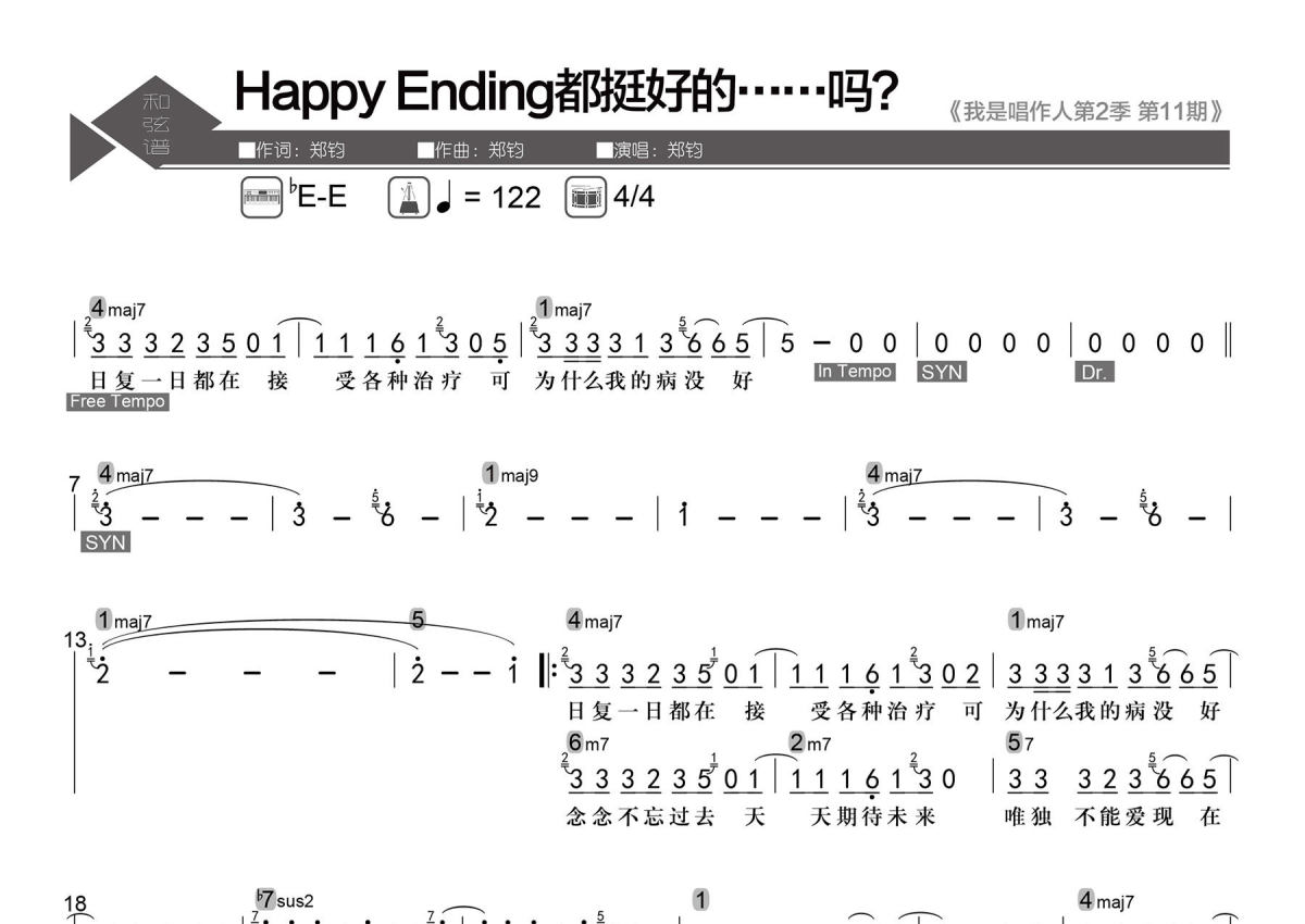 《Happy Ending都挺好的……吗?》是郑钧演唱的一首歌曲,数字级数和弦谱,拍号为4/4拍,歌曲速度为每分钟122拍,这份简谱共有两张高清图谱,图谱由 @老杨教吉他 编配上传【歌曲信息】Key:bE-E Tempo:4/4 每分钟122拍。 【整理信息】按原曲完整整理。 【和弦标记】数字级数。 【和弦难度】大、小三和弦,大六和弦,大、小、属七和弦,大九和弦,挂留和弦。