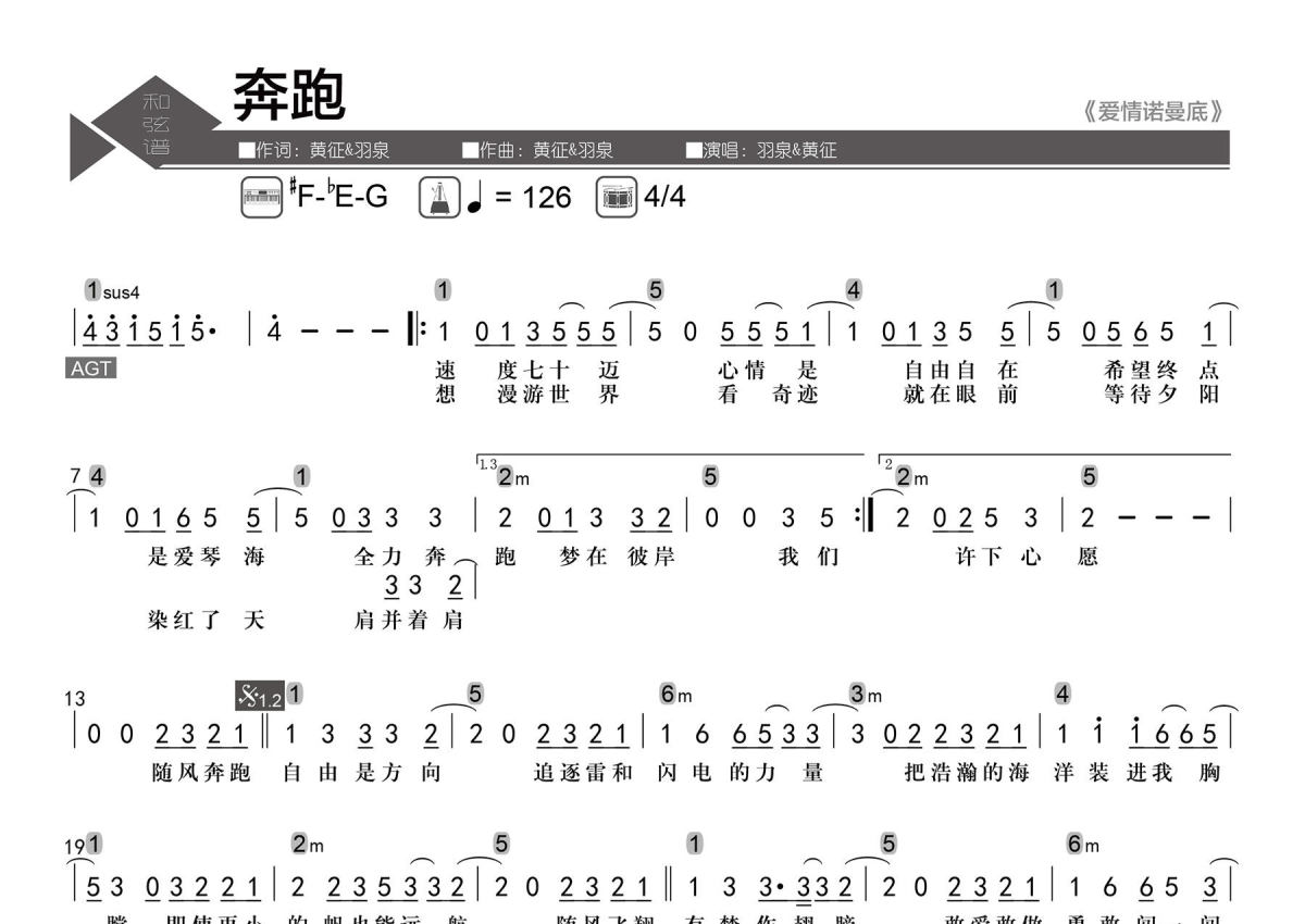 羽泉&黄征《奔跑》简谱 - 数字级数和弦谱