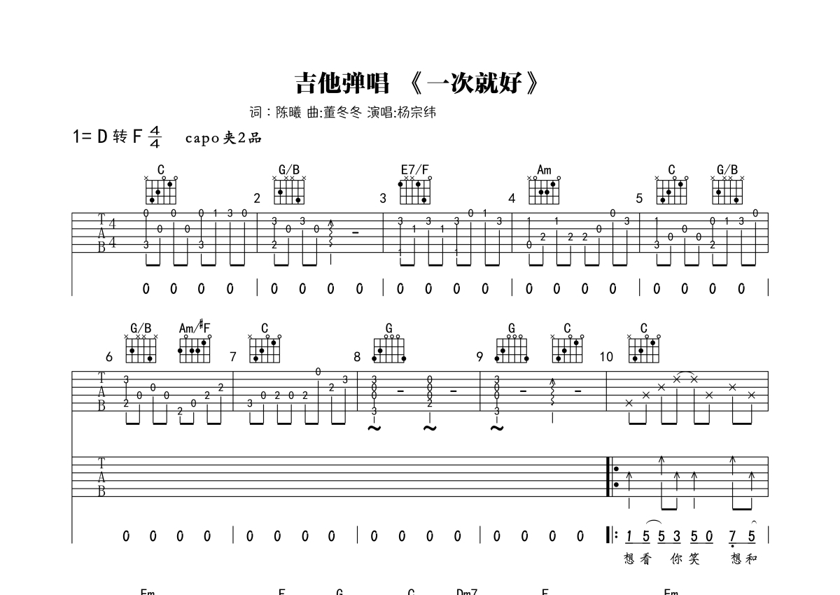 杨宗纬《一次就好》吉他谱 - C调弹唱六线谱