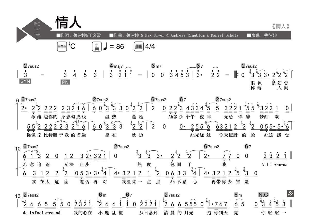 蔡徐坤《情人》简谱 - 数字级数和弦谱