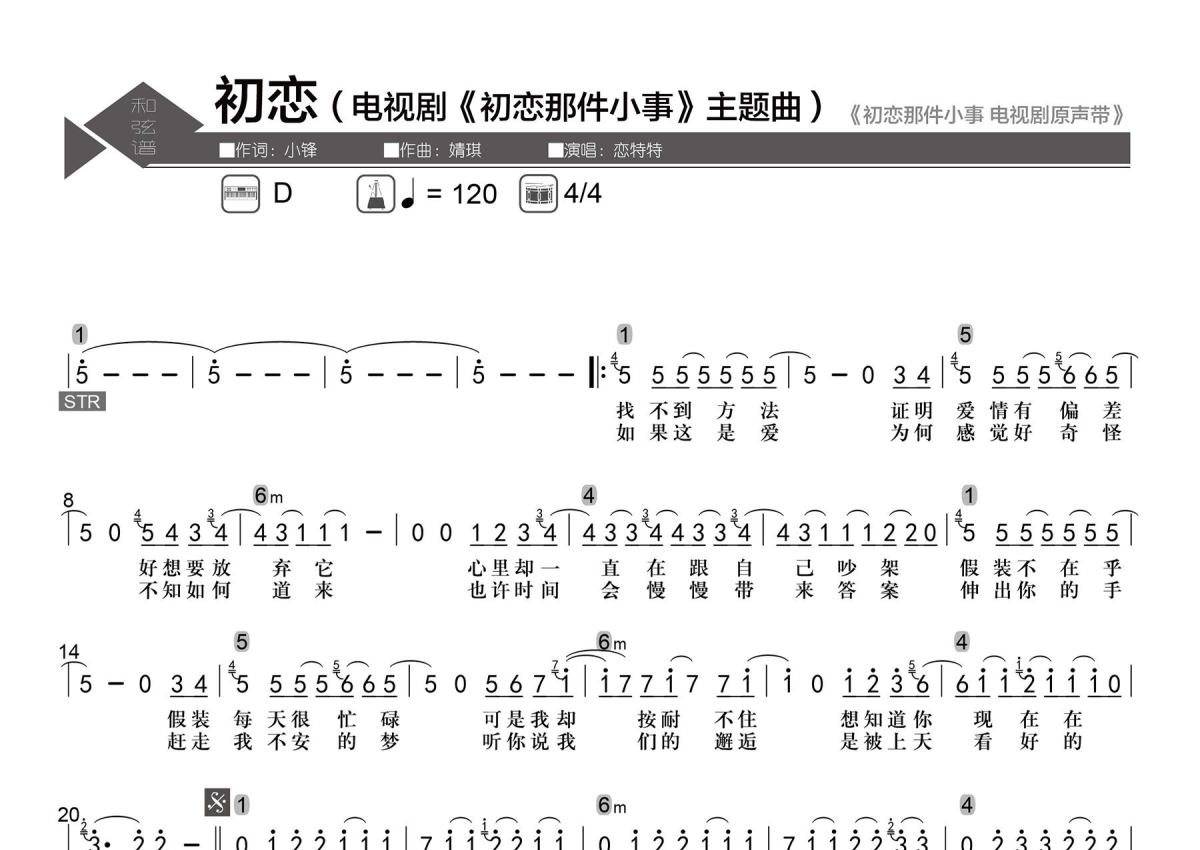 《初恋》是赖冠霖演唱的一首歌曲,数字级数和弦谱,拍号为4/4拍,歌曲速度为每分钟120拍,这份简谱共有一张高清图谱,图谱由 @老杨教吉他 编配上传【歌曲信息】Key:D Tempo:4/4 每分钟120拍。 【整理信息】按原曲完整整理。 【和弦标记】数字级数。 【和弦难度】大、小三和弦。