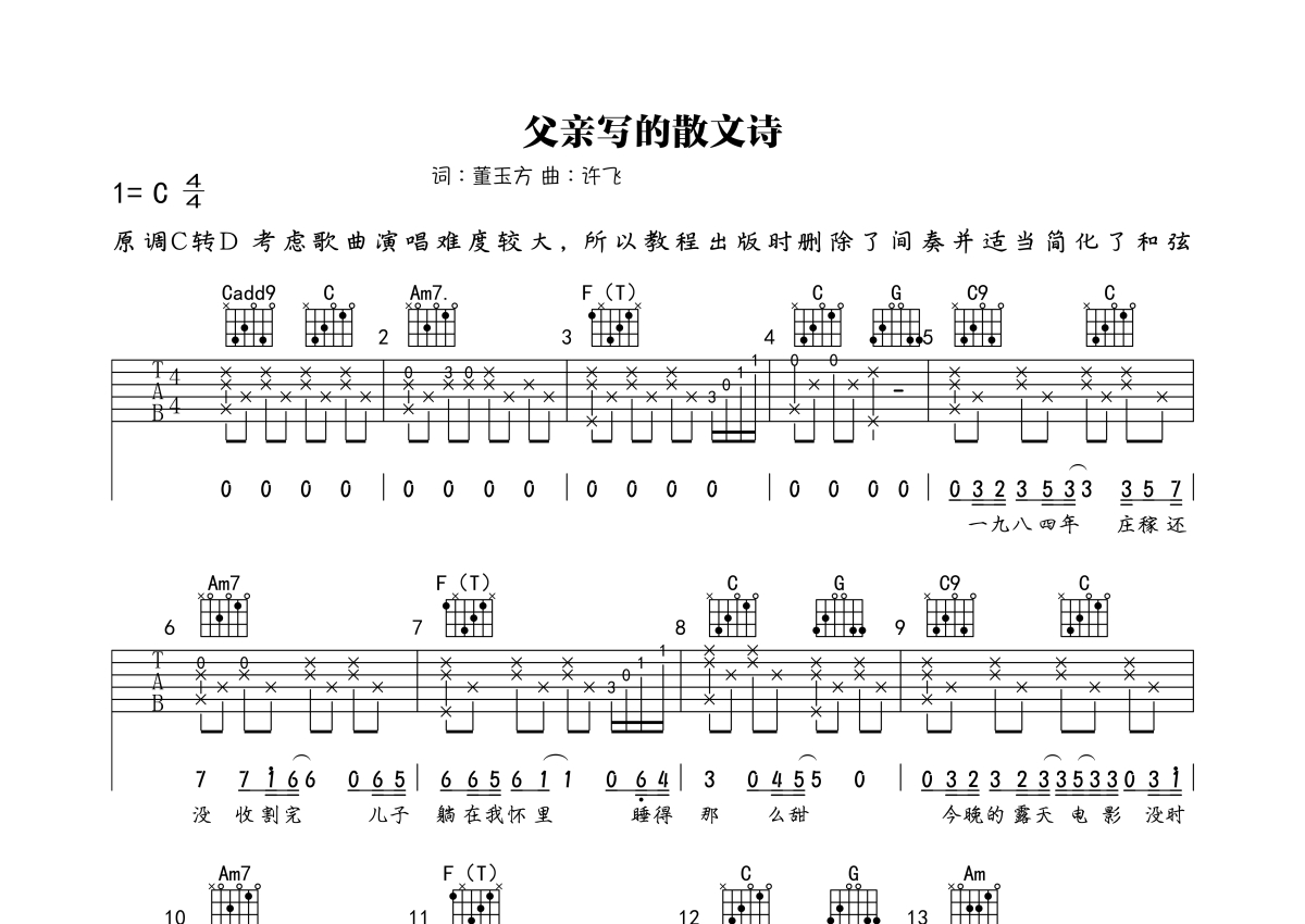 《父亲写的散文诗》是李健演唱的一首歌曲,本吉他谱采用的是C调指法编配,这份吉他谱共有四张高清图谱,图谱由 @深蓝雨吉他 编配上传,图谱使用六线谱编配,包含吉他和弦指法、简谱以及歌词部分,使用这份父亲写的散文诗吉他谱,可以让你更加方便地掌握这首歌曲的弹唱技巧,快来尝试吧。原调C转D,考虑歌曲演唱难度较大,所以教程出版时删除了间奏并适当简化了和弦。