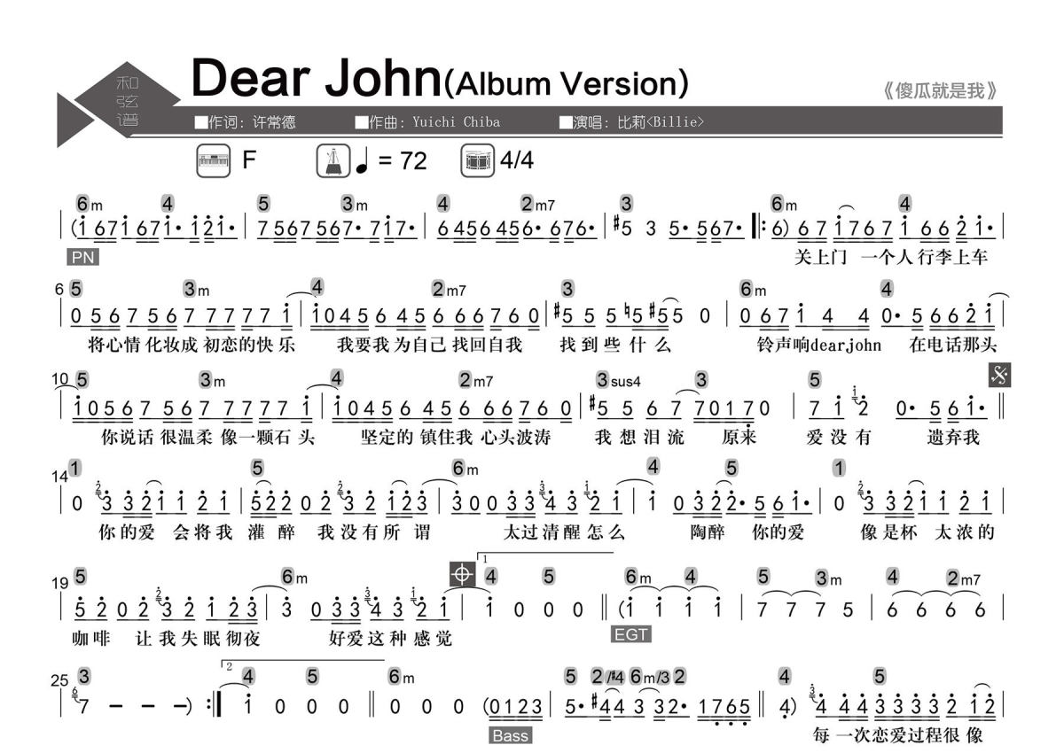 《Dear John》是比莉演唱的一首歌曲,数字级数和弦谱,拍号为4/4拍,歌曲速度为每分钟72拍,这份简谱共有一张高清图谱,图谱由 @老杨教吉他 编配上传【歌曲信息】Key:F Tempo:4/4 每分钟72拍。 【整理信息】按原曲完整整理。 【和弦标记】数字级数。 【和弦难度】大、小三和弦,大、小七和弦,挂留和弦,转位和弦。