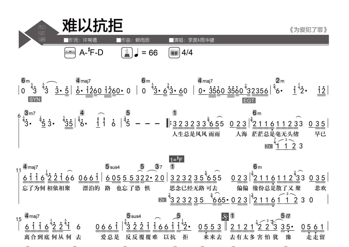 李度/周华健《难以抗拒》简谱 - 数字级数和弦谱