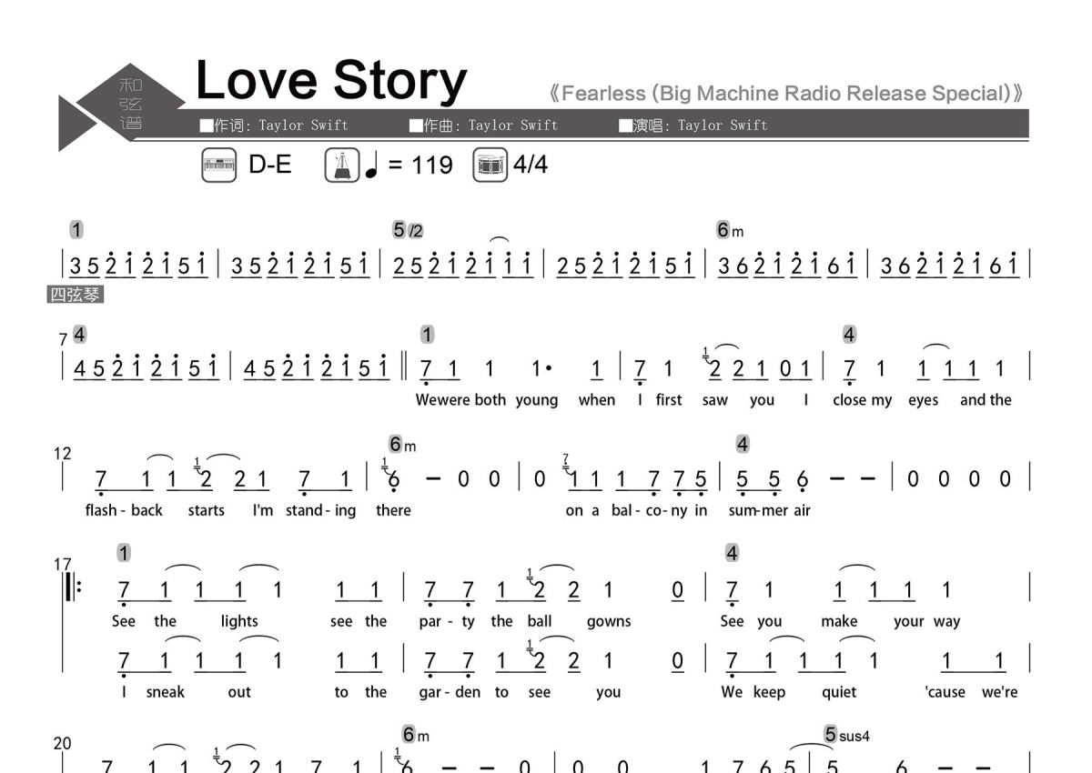 《Love Story》是Taylor Swift演唱的一首歌曲,数字级数和弦谱,拍号为4/4拍,歌曲速度为每分钟119拍,这份简谱共有两张高清图谱,图谱由 @老杨教吉他 编配上传【歌曲信息】Key:D-E Tempo:4/4 每分钟119拍。 【整理信息】按原曲完整整理。 【和弦标记】数字级数。 【和弦难度】大、小三和弦,加九和弦,挂留和弦。