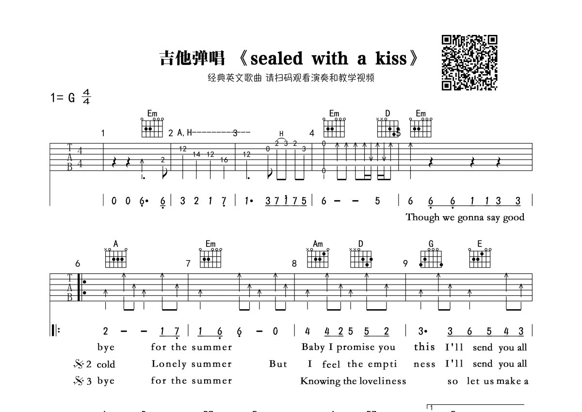《sealed with a kiss》是BrianHyland演唱的一首歌曲,本吉他谱采用的是G调指法编配,这份吉他谱共有两张高清图谱,图谱由 @深蓝雨吉他 编配上传,图谱使用六线谱编配,包含吉他和弦指法、简谱以及歌词部分,曲谱配备了相关的视频提供浏览,使用这份sealed with a kiss吉他谱,可以让你更加方便地掌握这首歌曲的弹唱技巧,快来尝试吧。Sealedwithakiss吉他谱,一首不朽的英文歌曲,以吻封缄六线谱高清版,BrianHyland演唱,《sealedwithakiss》吉他弹唱谱。美国电影《蝴蝶梦》主题曲,经典浪漫色彩的老歌,叙离别情,但不伤感;道分手苦,但不低沉。饱尝相思之苦的恋人们听来,肯定别有一番滋味。