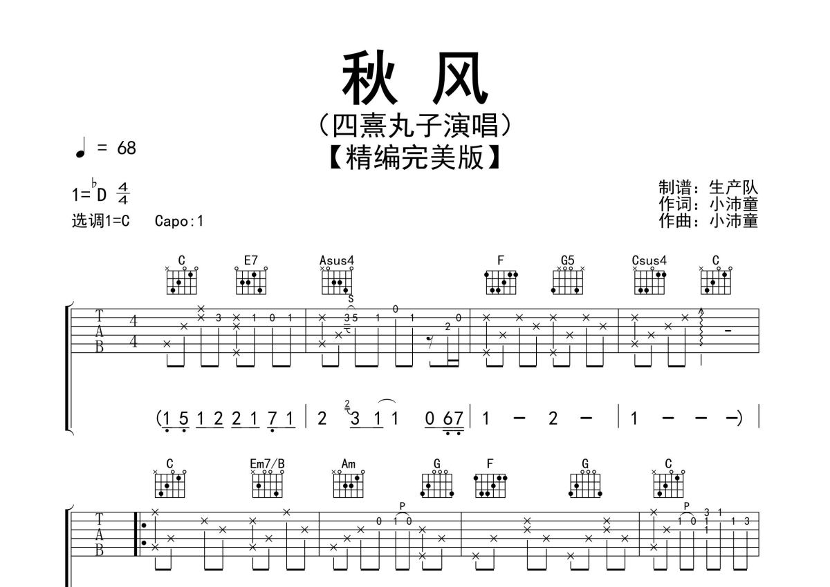 《秋风》是四熹丸子演唱的一首歌曲,精编完美版,拍号为4/4拍,歌曲速度为每分钟68拍,歌曲原调为Db调,但由于原调指法比较难,为了方便弹奏,本吉他谱采用的是C调指法编配,变调夹1品弹奏即为原调,当然也可以根据自己的音域改变变调夹位置,或者通过改变和弦调性,以方便自己弹奏,这份吉他谱共有三张高清图谱,图谱由 @生产队 编配上传,图谱使用六线谱编配,包含吉他和弦指法、简谱以及歌词部分,使用这份秋风吉他谱,可以让你更加方便地掌握这首歌曲的弹唱技巧,快来尝试吧。四熹丸子演唱的歌曲《秋风》原版吉他谱,精准的前奏、间奏solo编配,精编完美版,值得推荐的一首民谣歌曲!。