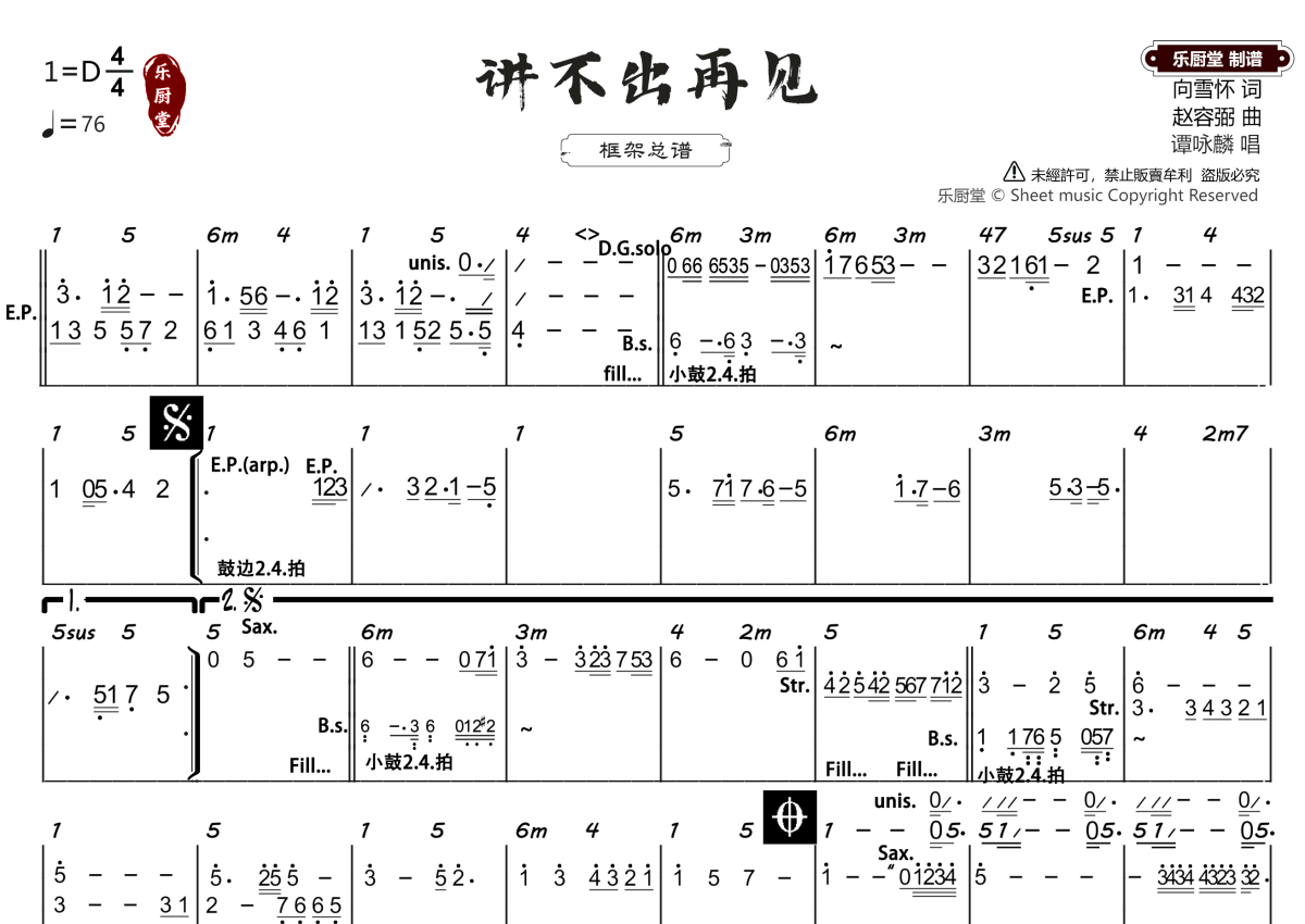 《讲不出再见》是谭咏麟演唱的一首歌曲,框架总谱,拍号为4/4拍,歌曲速度为每分钟76拍,这份乐队总谱共有一张高清图谱,图谱由 @乐厨堂 编配上传。