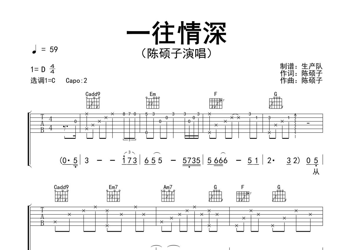 《一往情深》是陈硕子演唱的一首歌曲,精编完美版,拍号为4/4拍,歌曲速度为每分钟59拍,歌曲原调为D调,但由于原调指法比较难,为了方便弹奏,本吉他谱采用的是C调指法编配,变调夹2品弹奏即为原调,当然也可以根据自己的音域改变变调夹位置,或者通过改变和弦调性,以方便自己弹奏,这份吉他谱共有三张高清图谱,图谱由 @生产队 编配上传,图谱使用六线谱编配,包含吉他和弦指法、简谱以及歌词部分,使用这份一往情深吉他谱,可以让你更加方便地掌握这首歌曲的弹唱技巧,快来尝试吧。陈硕子作词、作曲并演唱的歌曲《一往情深》原版吉他谱,完整的前奏、间奏、尾奏solo编配,一首动听的歌曲,值得推荐!。