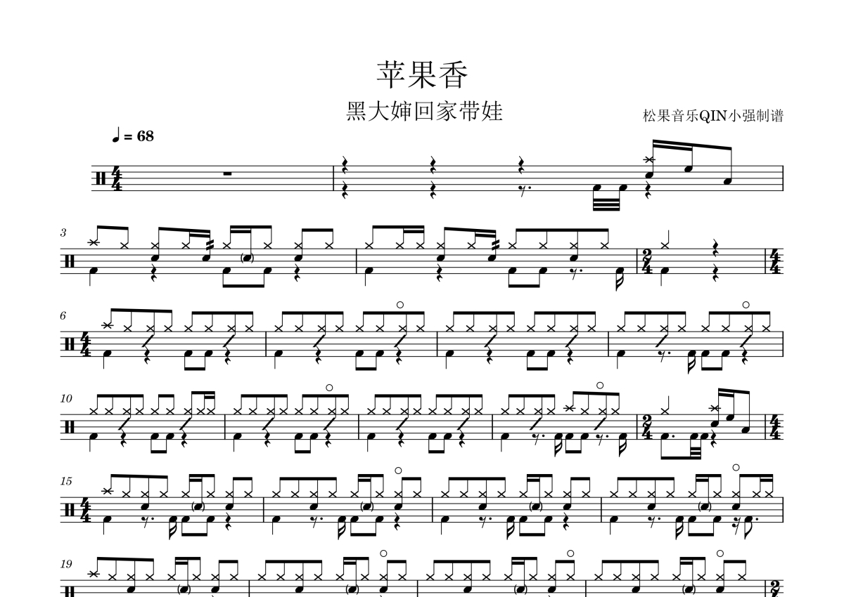 《苹果香》是黑大婶回乡带娃演唱的一首歌曲,拍号为4/4拍,这份架子鼓谱共有两张高清图谱,图谱由 @松果音乐QIN小强 编配上传,图谱使用五线谱编配,使用这份苹果香架子鼓谱,你将能够轻松地敲打出这首黑大婶回乡带娃的苹果香,快来尝试吧。《苹果香》是黑大婶回乡带娃演唱歌曲,唱片公司:中视星和文化,发行时间:2024-07-10。