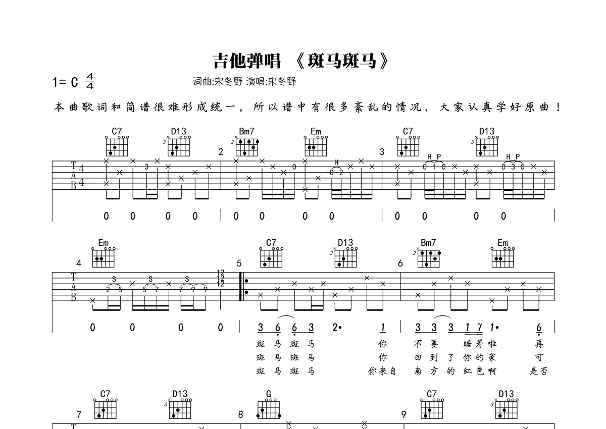 宋冬野《斑马斑马》吉他谱 - C调弹唱六线谱