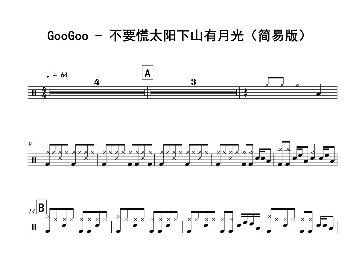 GooGoo《不要慌太阳下山有月光》架子鼓谱 - 简易版