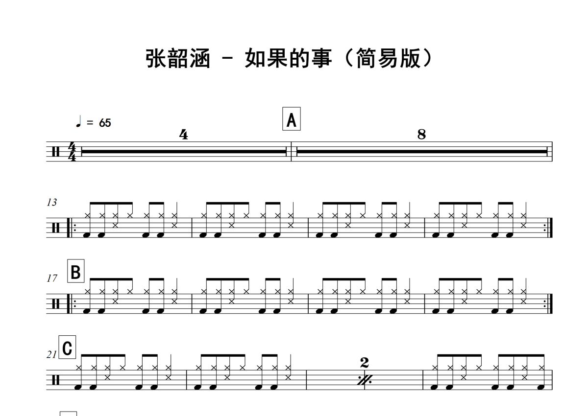 《如果的事》是张韶涵演唱的一首歌曲,简易版,拍号为4/4拍,歌曲速度为每分钟65拍,这份架子鼓谱共有一张高清图谱,图谱由 @小虎鼓谱 编配上传,图谱使用五线谱编配,使用这份如果的事架子鼓谱,你将能够轻松地敲打出这首张韶涵的如果的事,快来尝试吧。