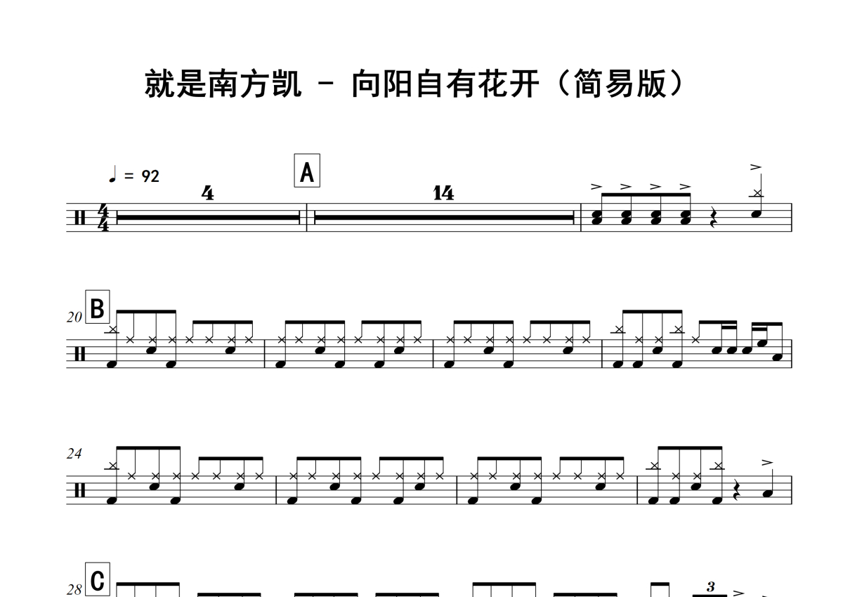 就是南方凯《向阳自有花开》架子鼓谱 - 简易版