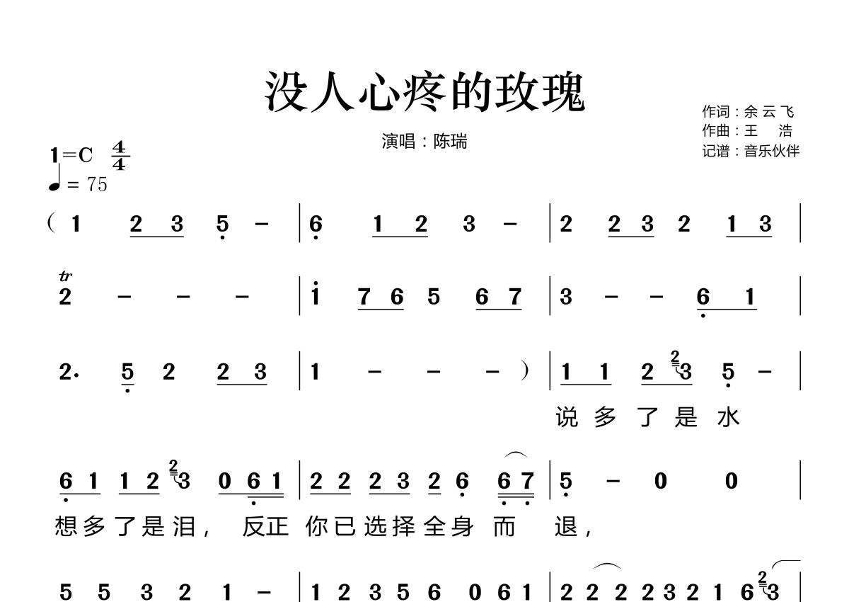《没人心疼的玫瑰》是陈瑞演唱的一首歌曲,这份简谱共有两张高清图谱,图谱由 @音乐伙伴 编配上传。