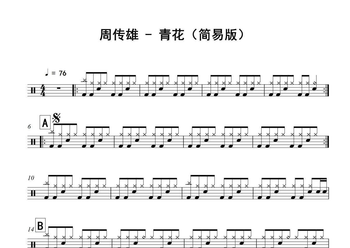 《青花》是周传雄演唱的一首歌曲,简易版,拍号为4/4拍,歌曲速度为每分钟76拍,这份架子鼓谱共有一张高清图谱,图谱由 @小虎鼓谱 编配上传,图谱使用五线谱编配,使用这份青花架子鼓谱,你将能够轻松地敲打出这首周传雄的青花,快来尝试吧。