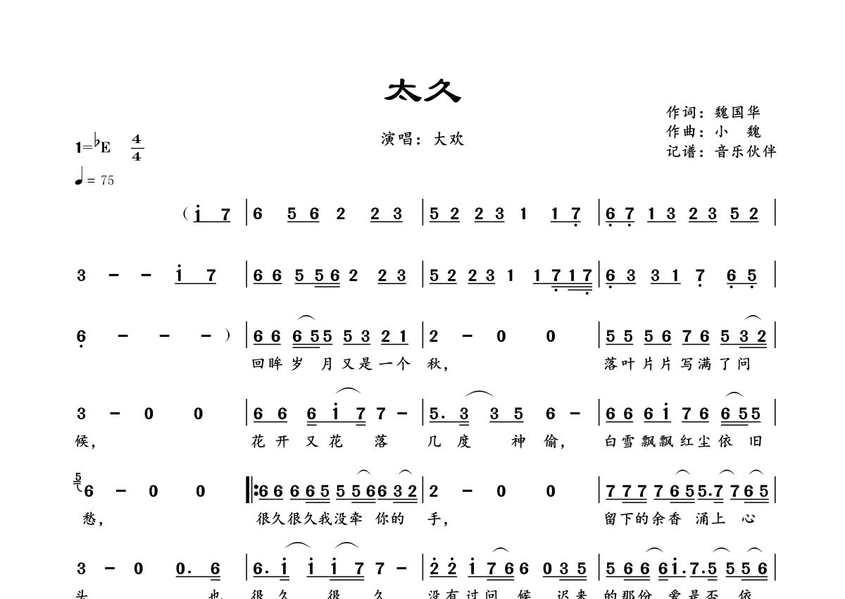 《太久》是大欢演唱的一首歌曲,拍号为4/4拍,歌曲速度为每分钟75拍,这份简谱共有一张高清图谱,图谱由 @音乐伙伴 编配上传。