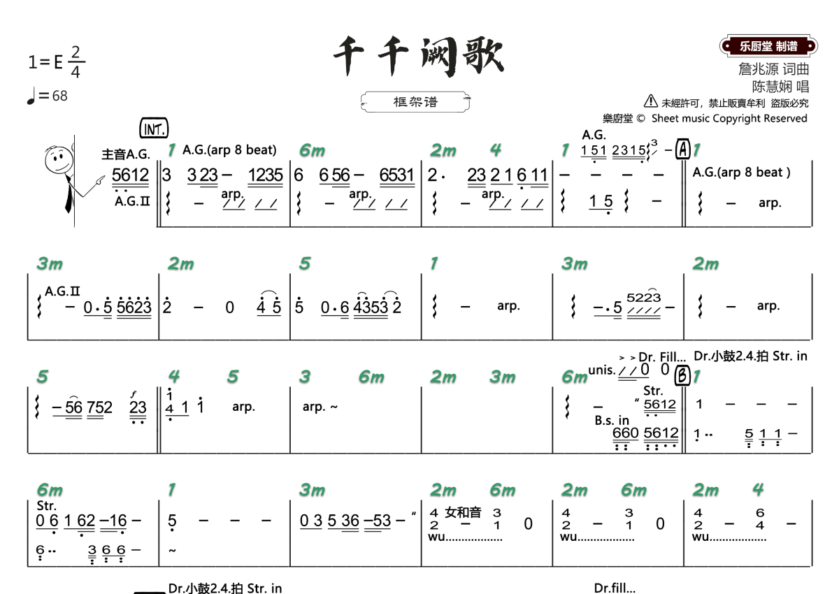 “乐厨堂”乐谱发布小组: 出版级乐谱扒谱制谱——以职业乐手圈通行标准记谱,遵循原版和声、伴奏元素和段落结构。 ❶ 2.0多功能专业团谱:采用台湾卓著公司开创的二代简谱标准制作。二代简谱无疑是迄今为止最科学、最易读的专业范畴多功能记谱方案:❷ 框架谱:采用职业乐手通常记谱方案制作。