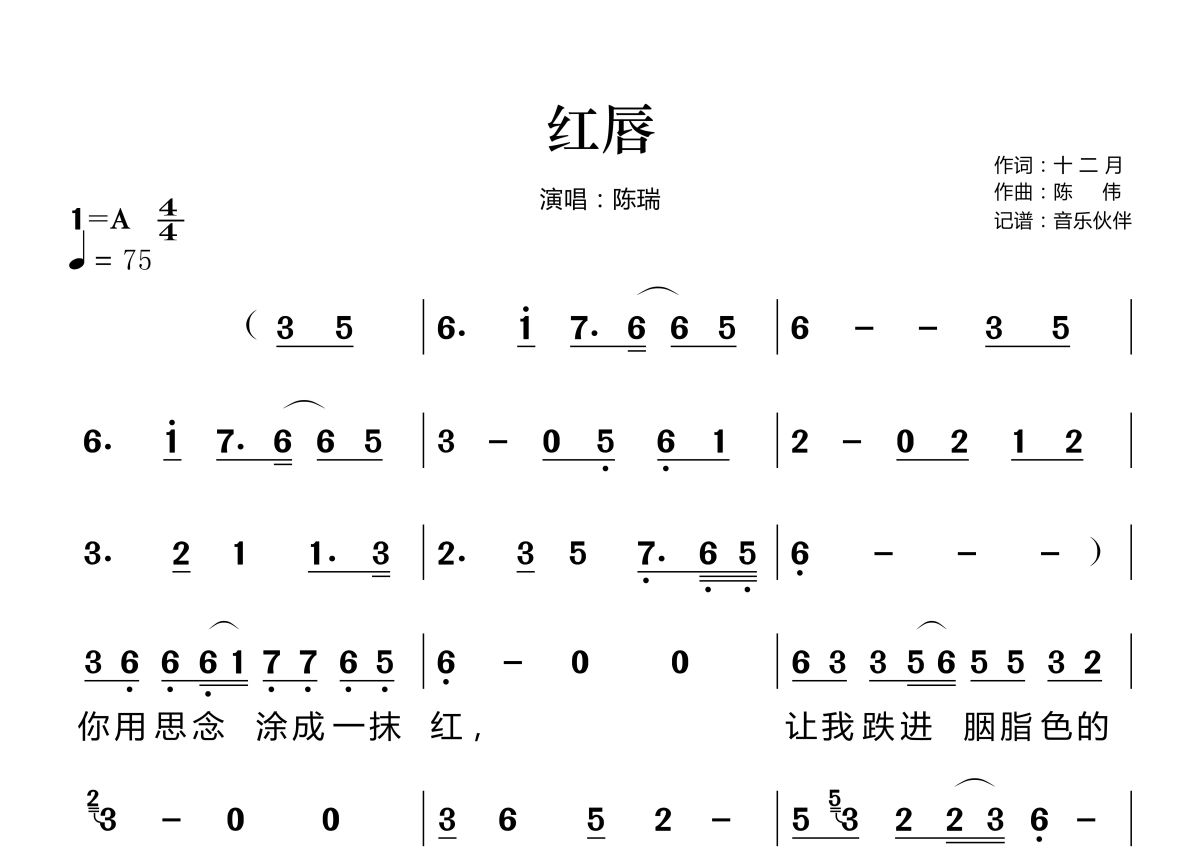 红唇简谱 - 陈瑞演唱