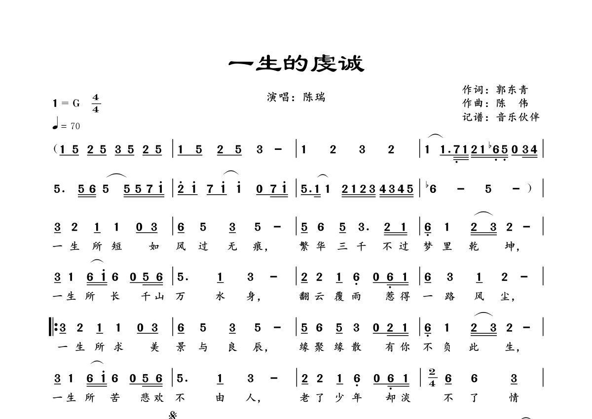 《一生的虔诚》是陈瑞演唱的一首歌曲,拍号为4/4拍,歌曲速度为每分钟70拍,这份简谱共有一张高清图谱,图谱由 @音乐伙伴 编配上传。