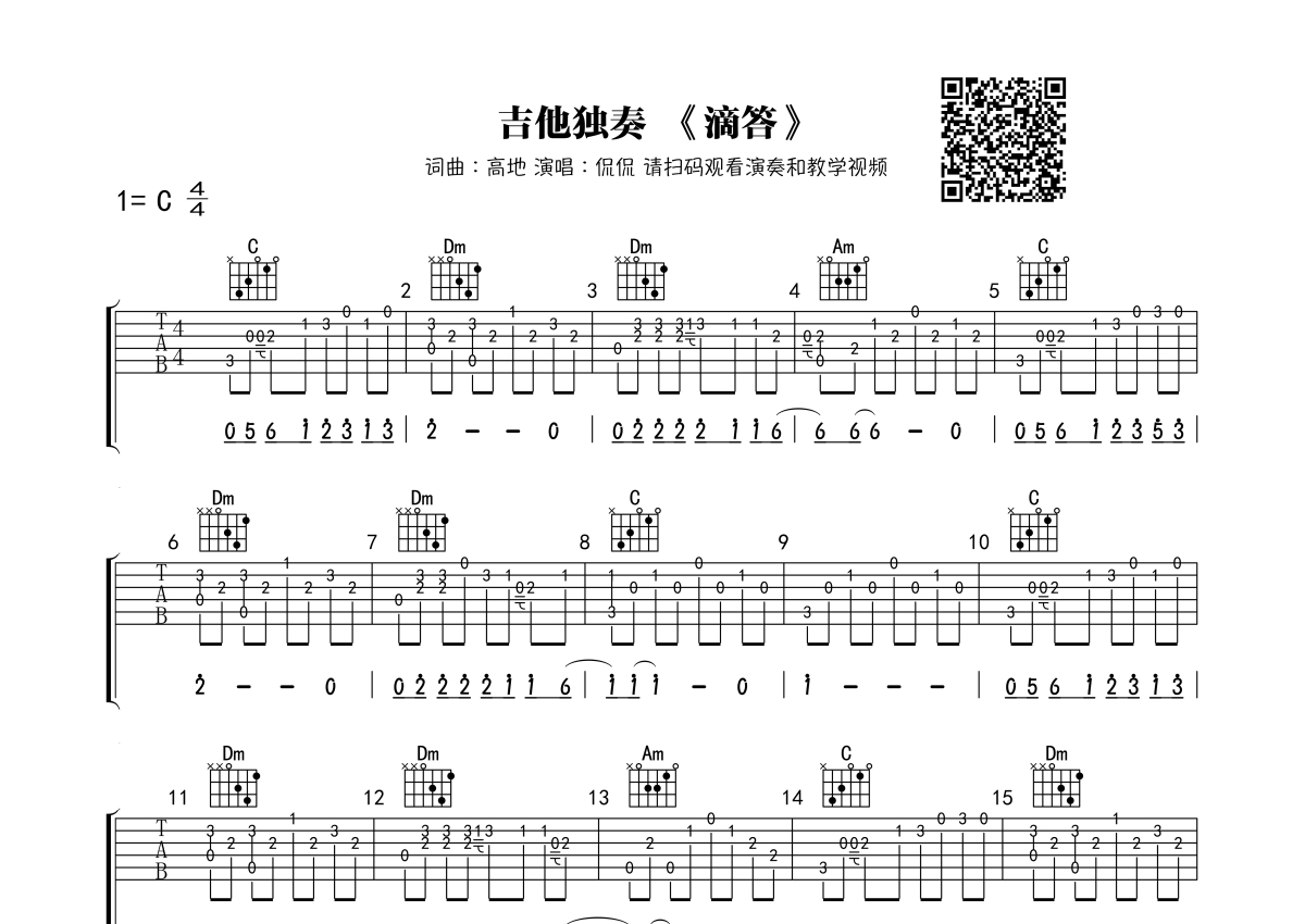 侃侃《滴答》吉他谱 - C调独奏六线谱
