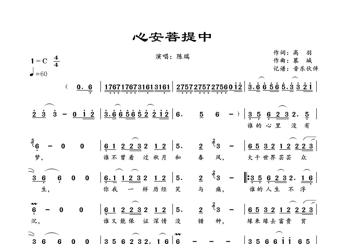 心安菩提中简谱 - 陈瑞演唱