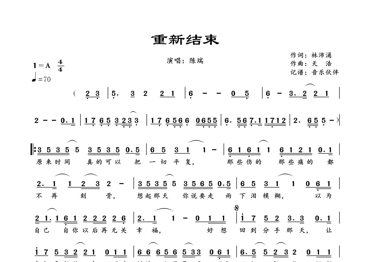 《重新结束》是陈瑞演唱的一首歌曲,拍号为4/4拍,歌曲速度为每分钟70拍,这份简谱共有一张高清图谱,图谱由 @音乐伙伴 编配上传。