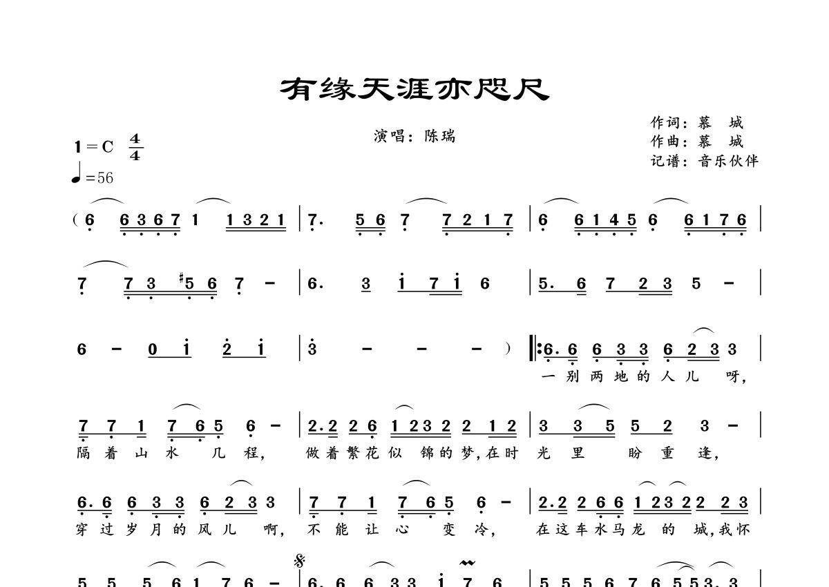 有缘天涯亦咫尺简谱 - 陈瑞演唱
