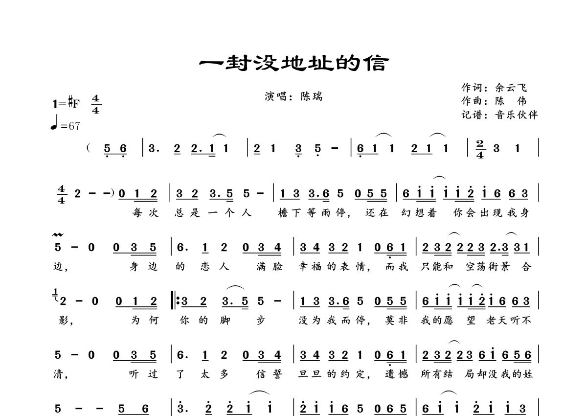 《一封没地址的信》是陈瑞演唱的一首歌曲,拍号为4/4拍,歌曲速度为每分钟67拍,这份简谱共有一张高清图谱,图谱由 @音乐伙伴 编配上传。