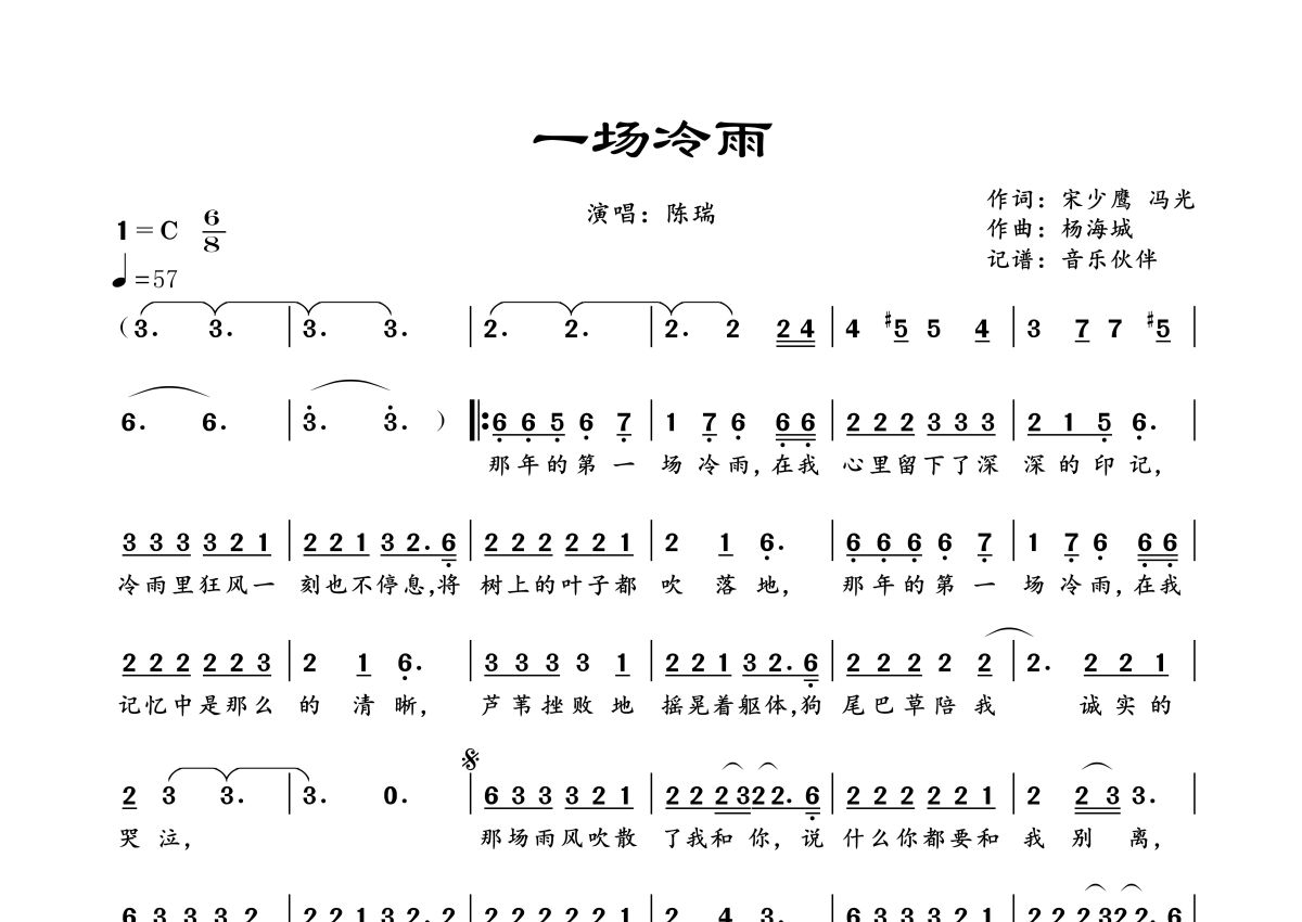 《一场冷雨》是陈瑞演唱的一首歌曲,拍号为6/8拍,歌曲速度为每分钟57拍,这份简谱共有一张高清图谱,图谱由 @音乐伙伴 编配上传。