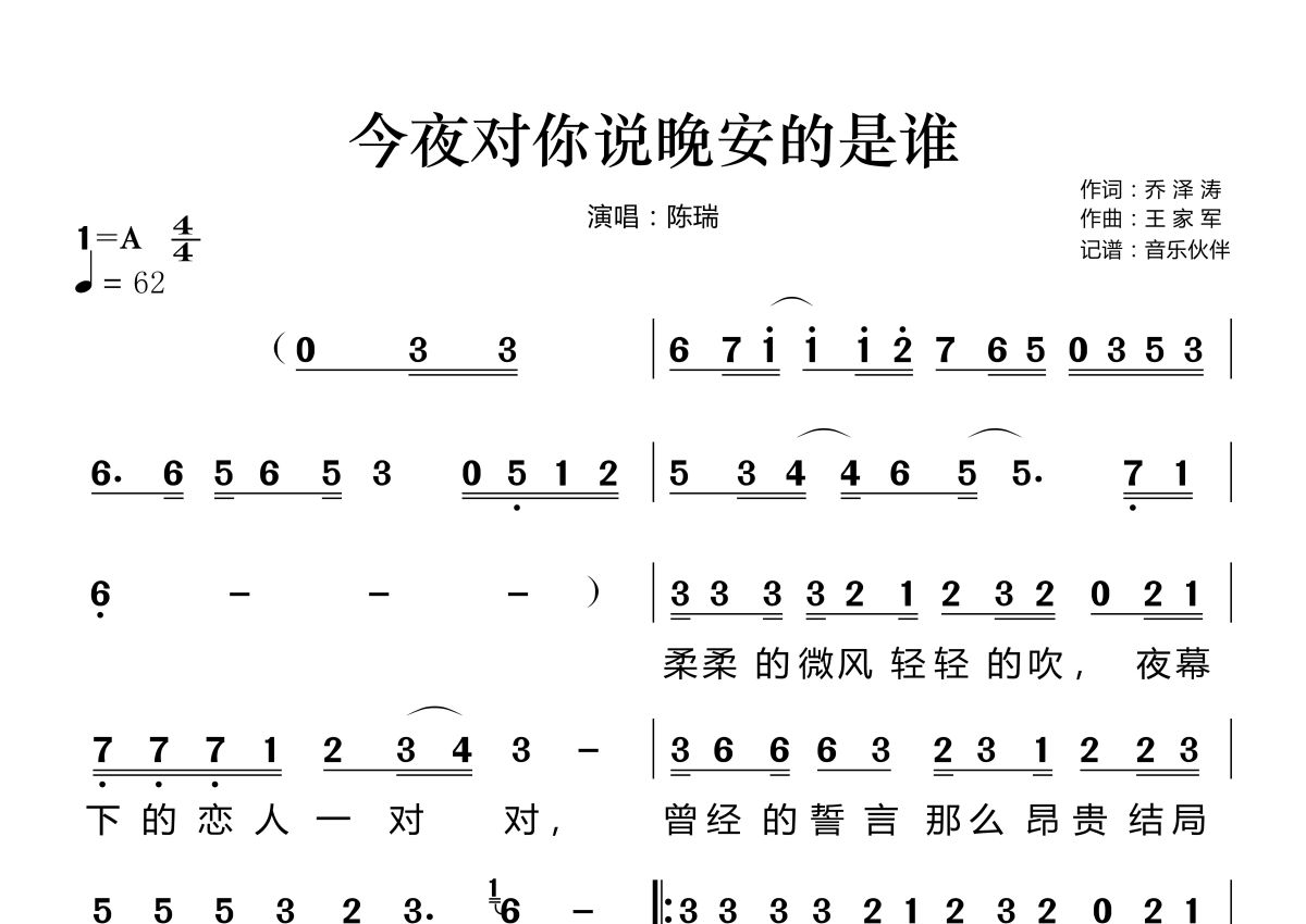 《今夜对你说晚安的是谁》是陈瑞演唱的一首歌曲,拍号为4/4拍,歌曲速度为每分钟62拍,这份简谱共有两张高清图谱,图谱由 @音乐伙伴 编配上传。