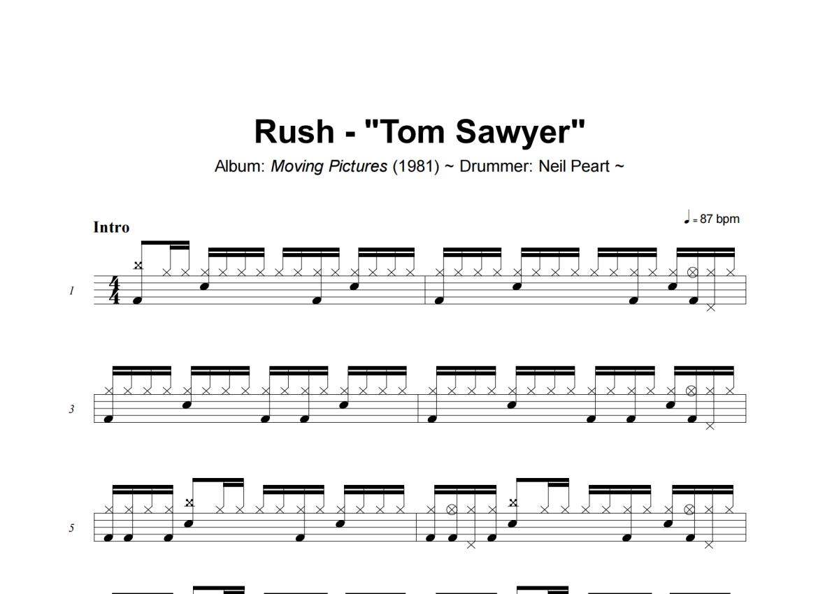 《Tom Sawyer》是Rush演唱的一首歌曲,拍号为4/4拍,这份架子鼓谱共有六张高清图谱,图谱由 @小虎鼓谱 编配上传,图谱使用五线谱编配,使用这份Tom Sawyer架子鼓谱,你将能够轻松地敲打出这首Rush的Tom Sawyer,快来尝试吧。