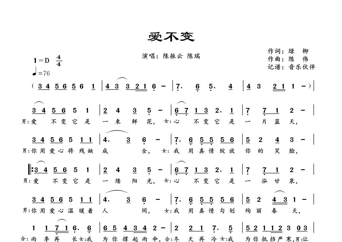 《爱不变》是陈振云 陈瑞演唱的一首歌曲,拍号为4/4拍,歌曲速度为每分钟76拍,这份简谱共有一张高清图谱,图谱由 @音乐伙伴 编配上传。