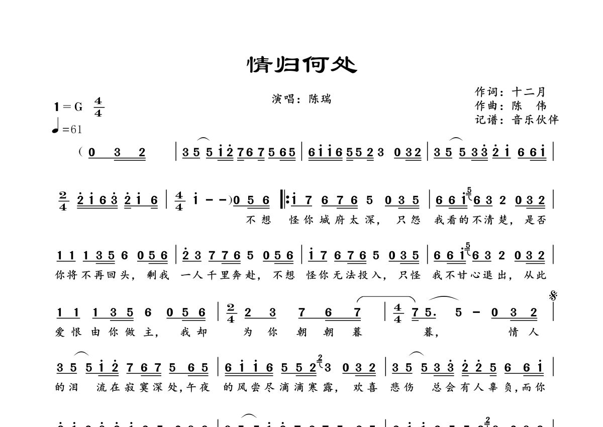 《情归何处》是陈瑞演唱的一首歌曲,拍号为4/4拍,歌曲速度为每分钟61拍,这份简谱共有一张高清图谱,图谱由 @音乐伙伴 编配上传。