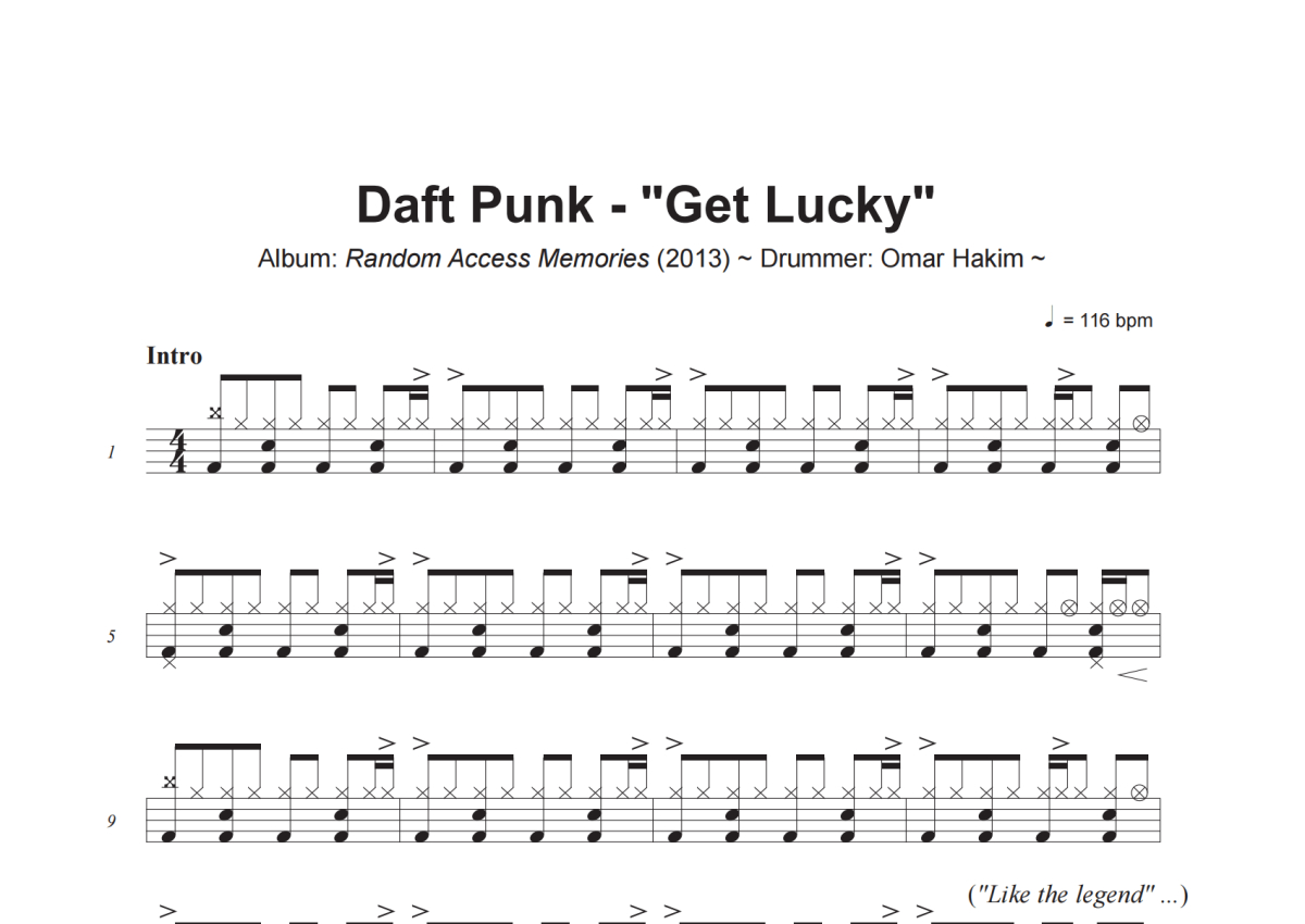 《Get Lucky》是Daft Punk演唱的一首歌曲,拍号为4/4拍,这份架子鼓谱共有六张高清图谱,图谱由 @小虎鼓谱 编配上传,图谱使用五线谱编配,使用这份Get Lucky架子鼓谱,你将能够轻松地敲打出这首Daft Punk的Get Lucky,快来尝试吧。