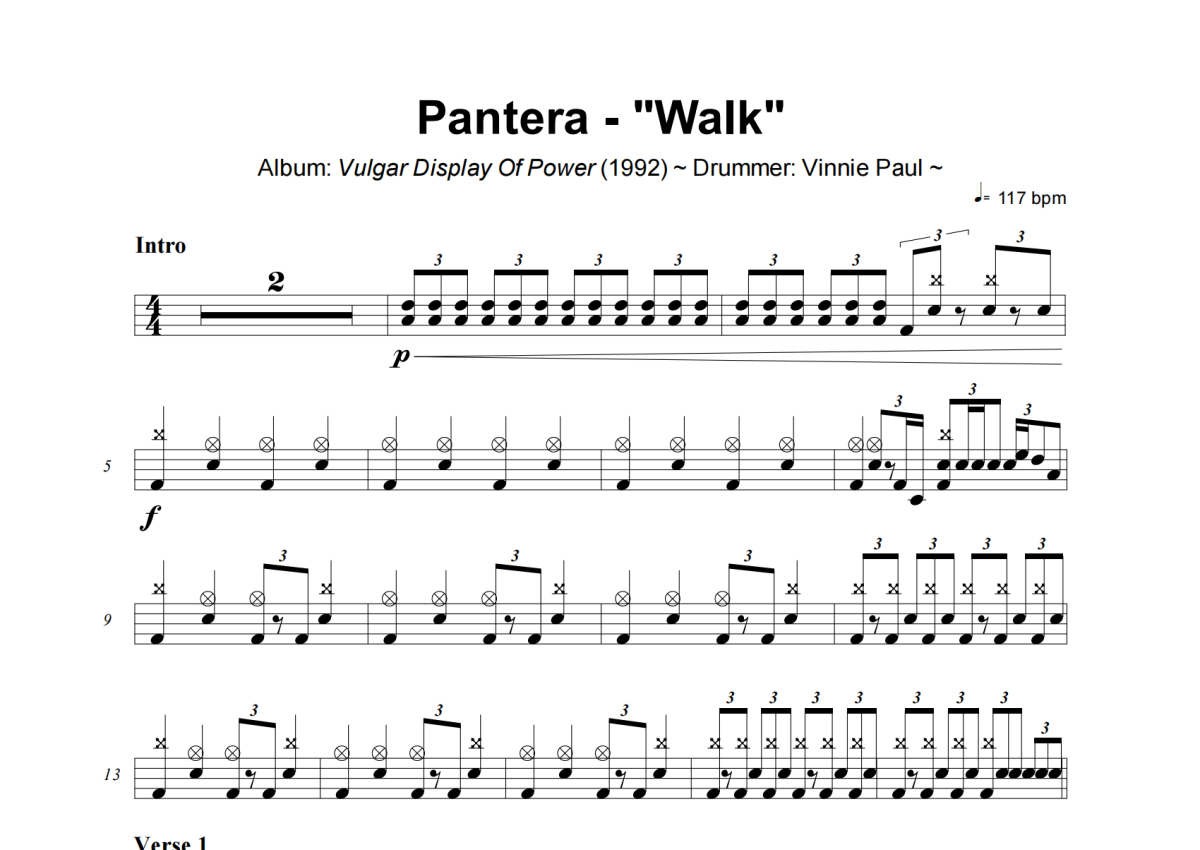 《Walk》是Pantera演唱的一首歌曲,拍号为4/4拍,这份架子鼓谱共有五张高清图谱,图谱由 @小虎鼓谱 编配上传,图谱使用五线谱编配,使用这份Walk架子鼓谱,你将能够轻松地敲打出这首Pantera的Walk,快来尝试吧。