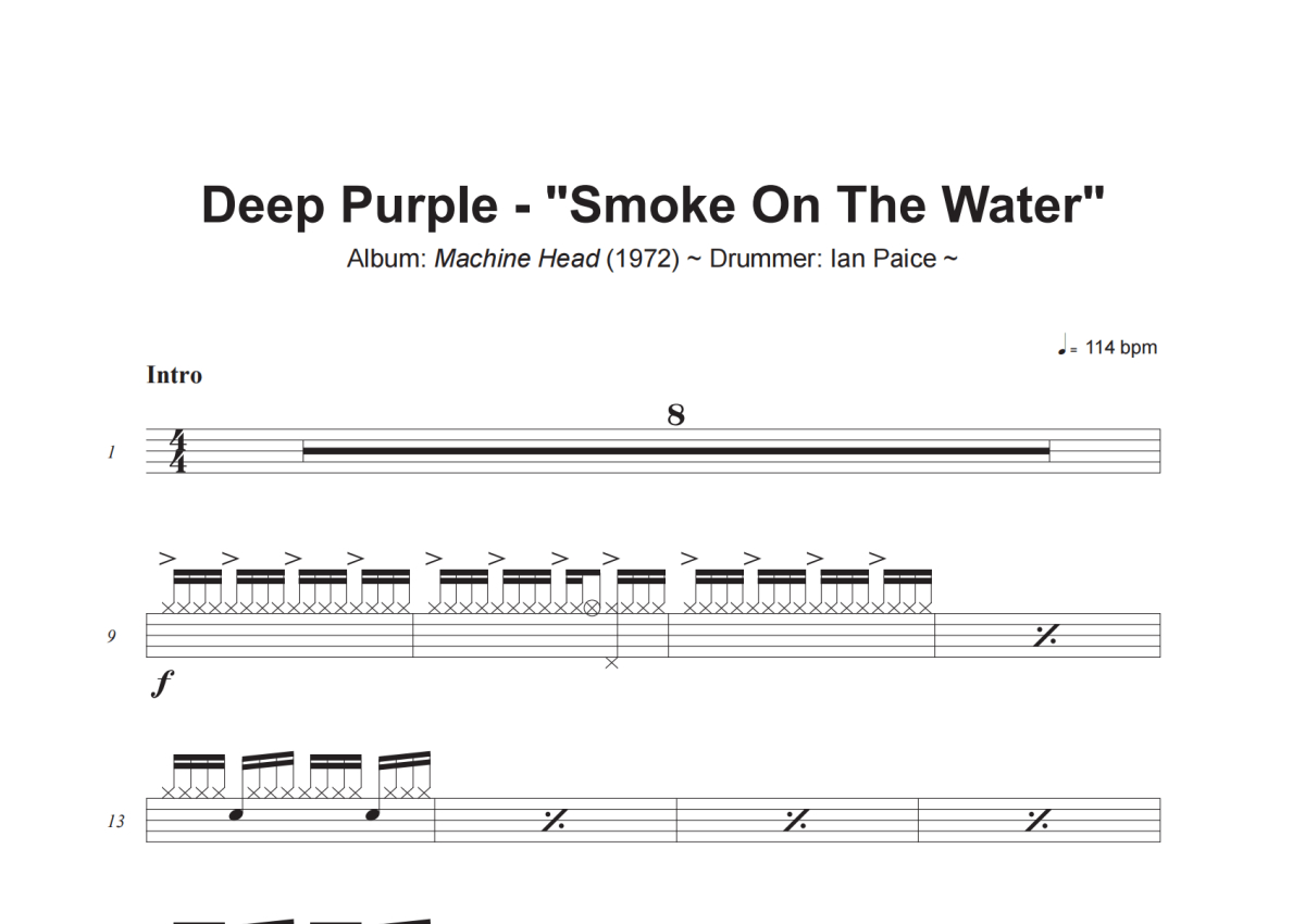 《Smoke On the Water》是Deep Purple演唱的一首歌曲,拍号为4/4拍,这份架子鼓谱共有六张高清图谱,图谱由 @小虎鼓谱 编配上传,图谱使用五线谱编配,使用这份Smoke On the Water架子鼓谱,你将能够轻松地敲打出这首Deep Purple的Smoke On the Water,快来尝试吧。