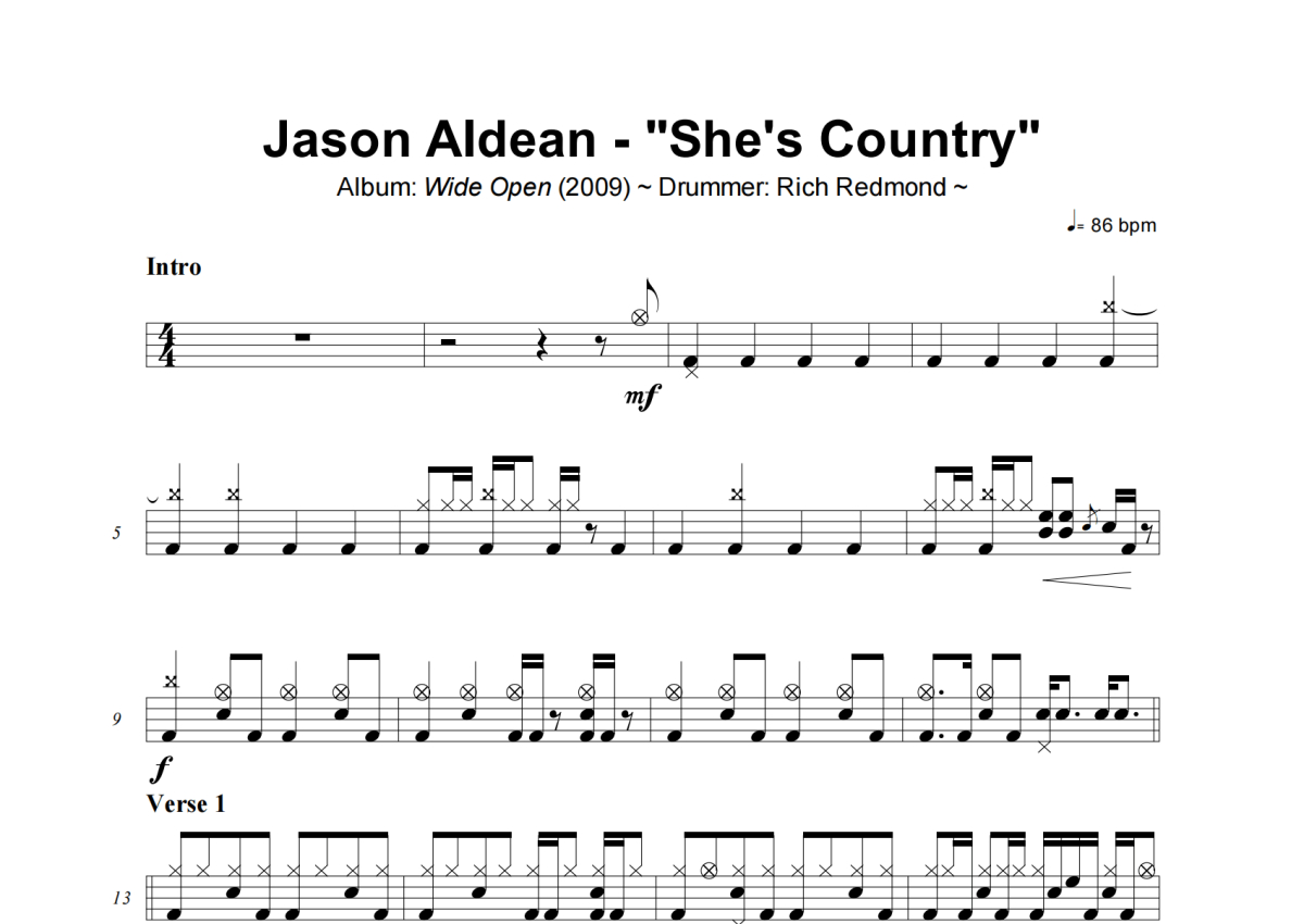 《She's Country》是Jason Aldean演唱的一首歌曲,拍号为4/4拍,这份架子鼓谱共有三张高清图谱,图谱由 @小虎鼓谱 编配上传,图谱使用五线谱编配,使用这份She's Country架子鼓谱,你将能够轻松地敲打出这首Jason Aldean的She's Country,快来尝试吧。