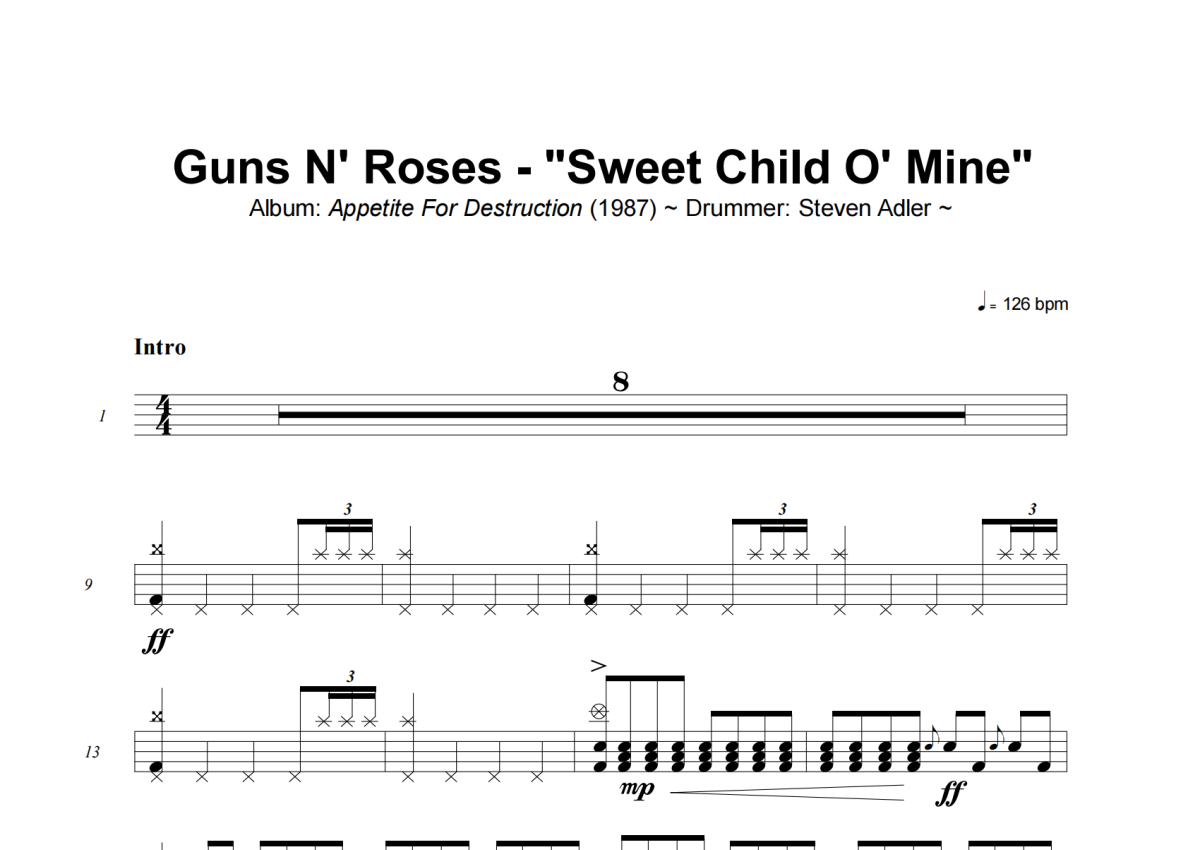 Guns N' Roses《Sweet Child O' Mine》架子鼓谱