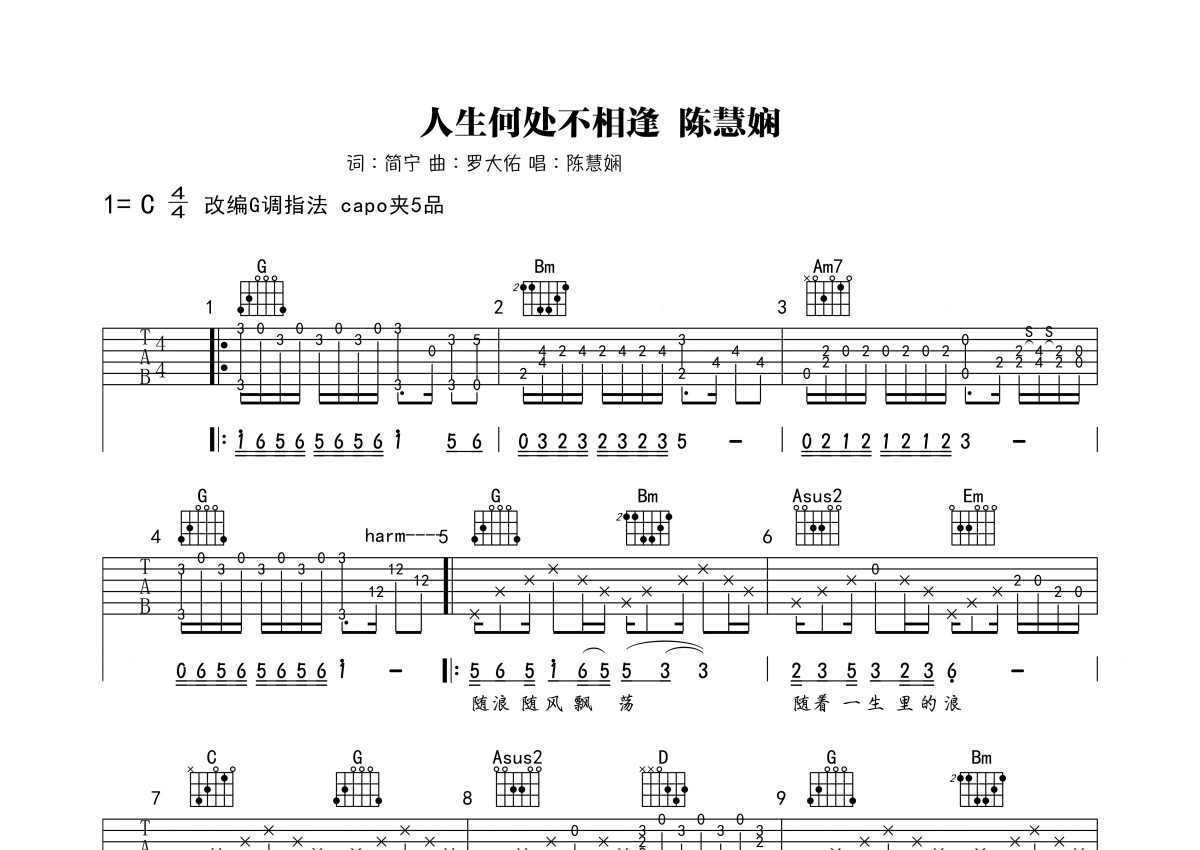 《人生何处不相逢》是陈慧娴演唱的一首歌曲,本吉他谱采用的是G调指法编配,这份吉他谱共有两张高清图谱,图谱由 @深蓝雨吉他 编配上传,图谱使用六线谱编配,包含吉他和弦指法、简谱以及歌词部分,曲谱配备了相关的视频提供浏览,使用这份人生何处不相逢吉他谱,可以让你更加方便地掌握这首歌曲的弹唱技巧,快来尝试吧。陈慧娴《人生何处不相逢》吉他谱,原调C,选调G,变调夹夹五品,一首经典的粤语歌曲,随谱附上配套吉他弹唱教学视频。人生就是一场又一场的相逢,驿路策马,长亭短憩,一回眸一驻足,可能是一场相逢。而生活最撩人心魄的是,你永远不知道,在下一刻,在下一个地方,会有哪一个人,不早不晚 不远不近,在等着你......。