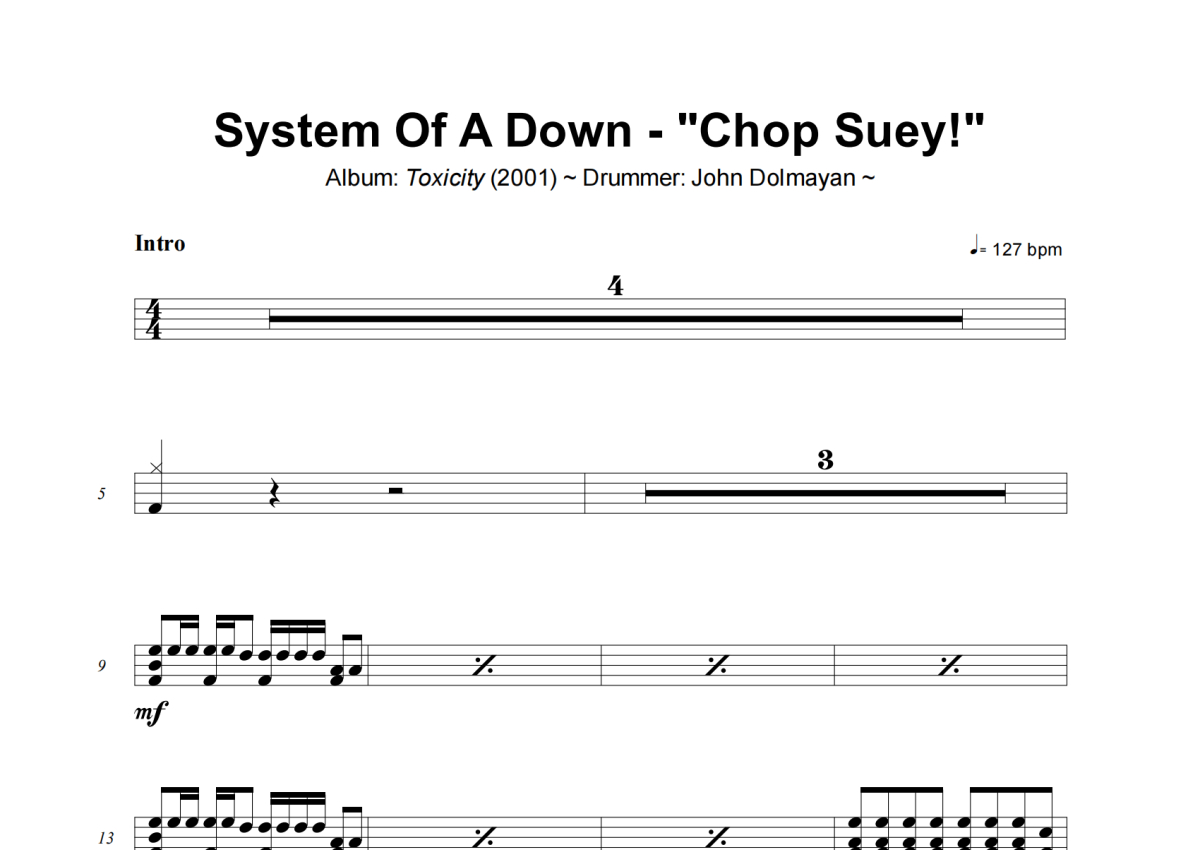《Chop Suey!》是System Of A Down演唱的一首歌曲,拍号为4/4拍,这份架子鼓谱共有四张高清图谱,图谱由 @小虎鼓谱 编配上传,图谱使用五线谱编配,使用这份Chop Suey!架子鼓谱,你将能够轻松地敲打出这首System Of A Down的Chop Suey!,快来尝试吧。