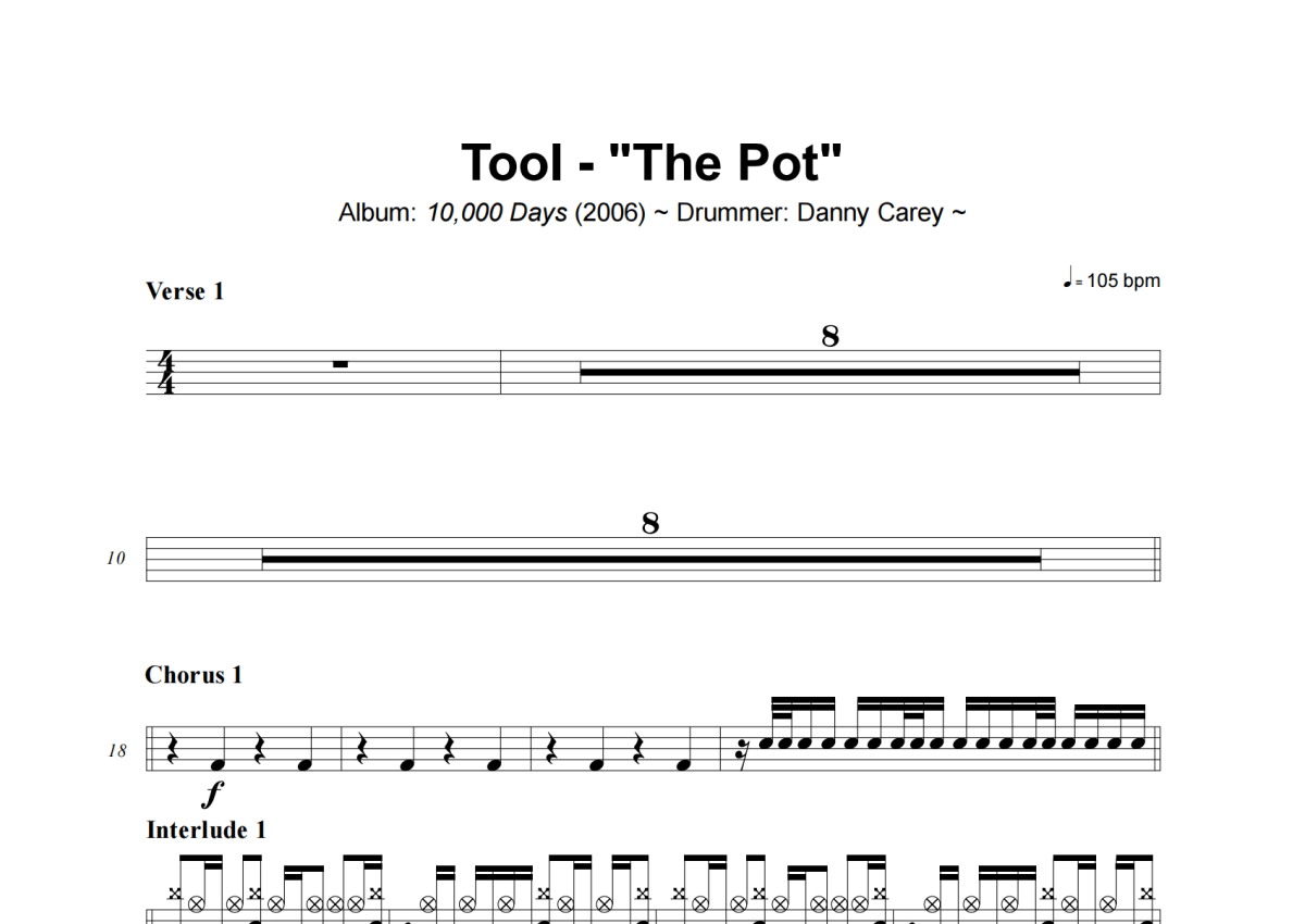 《The Pot》是Tool演唱的一首歌曲,拍号为4/4拍,这份架子鼓谱共有七张高清图谱,图谱由 @小虎鼓谱 编配上传,图谱使用五线谱编配,使用这份The Pot架子鼓谱,你将能够轻松地敲打出这首Tool的The Pot,快来尝试吧。