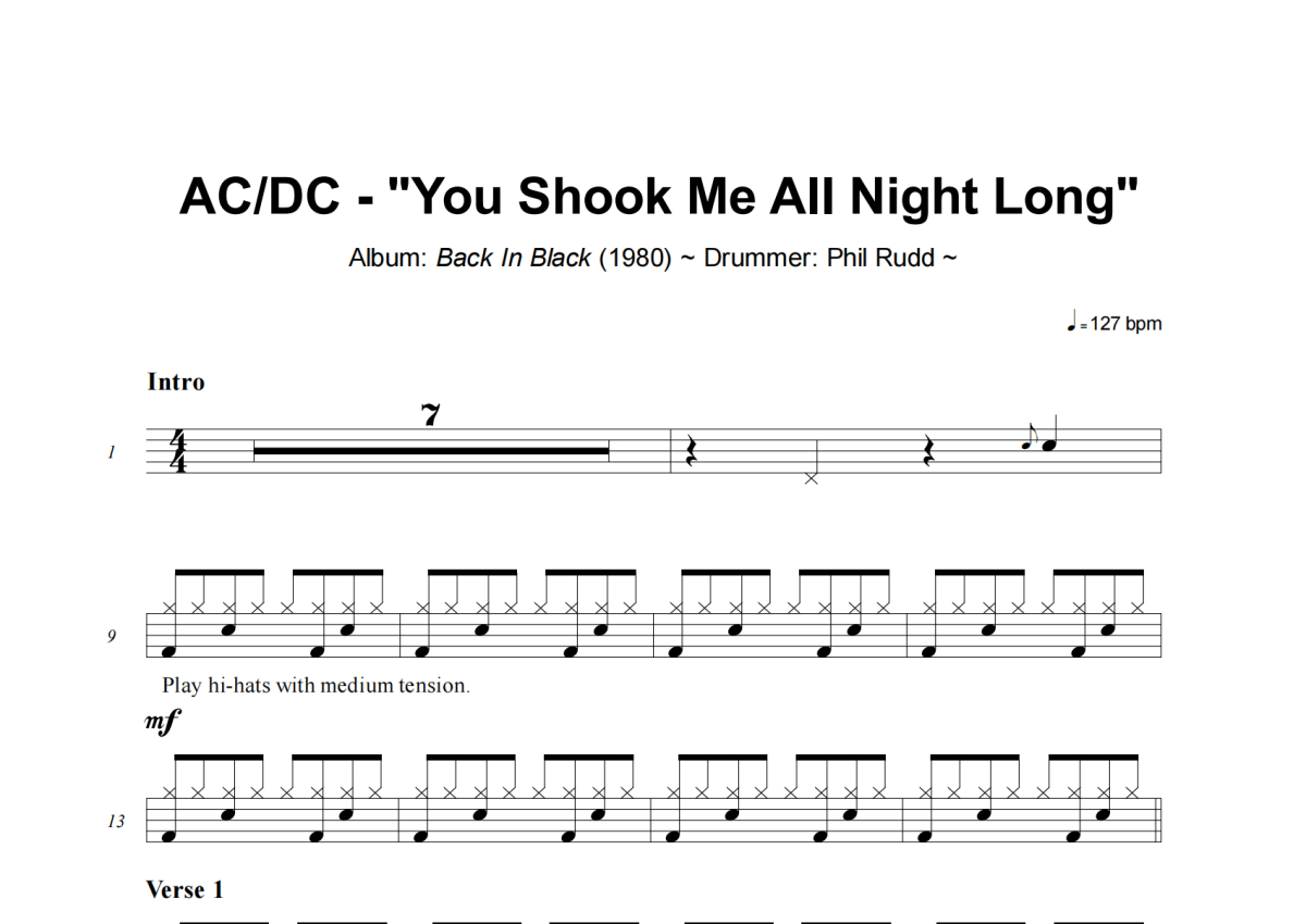 AC/DC《You Shook Me All Night Long》架子鼓谱
