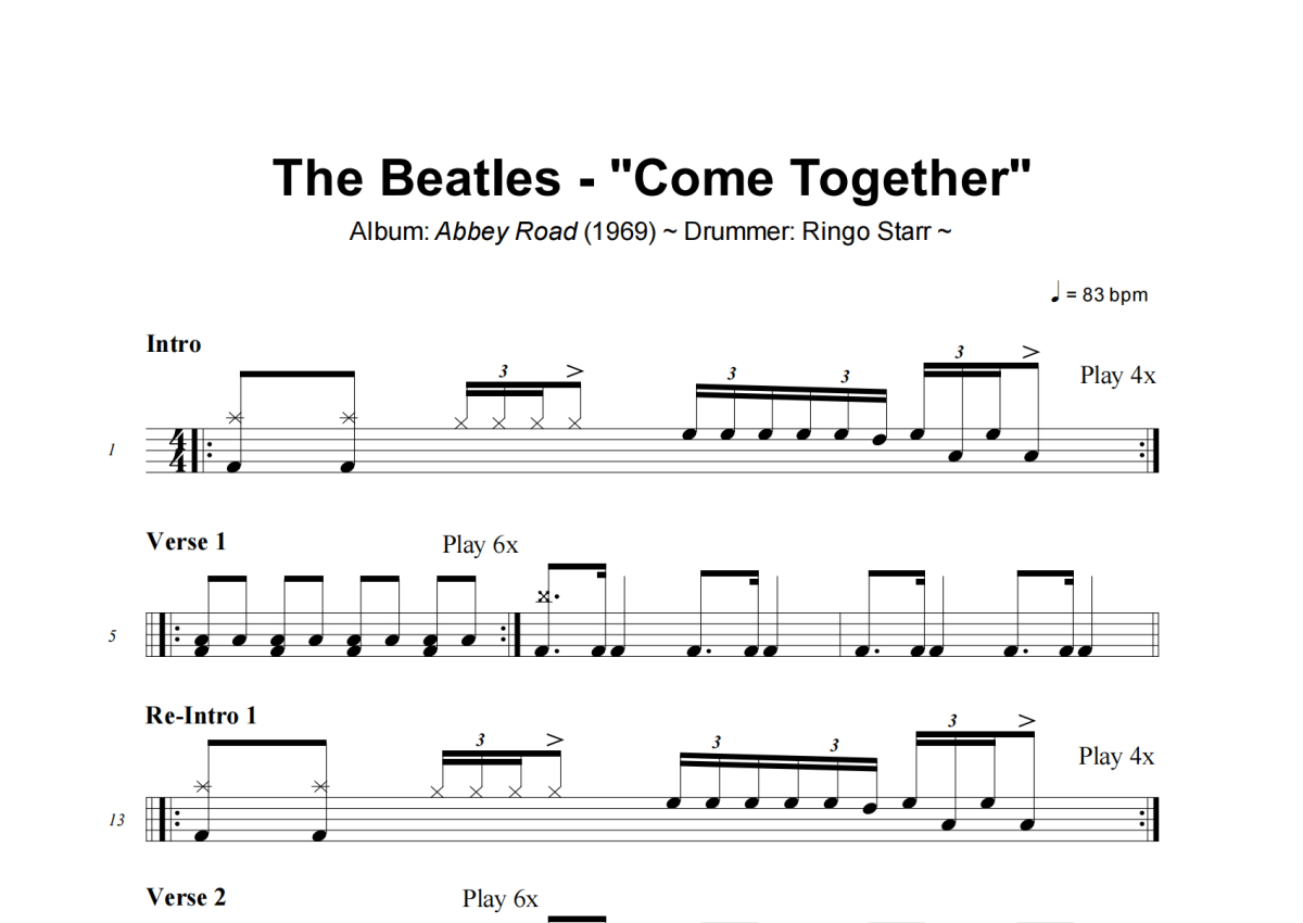 《Come Together》是The Beatles演唱的一首歌曲,拍号为4/4拍,这份架子鼓谱共有三张高清图谱,图谱由 @小虎鼓谱 编配上传,图谱使用五线谱编配,使用这份Come Together架子鼓谱,你将能够轻松地敲打出这首The Beatles的Come Together,快来尝试吧。