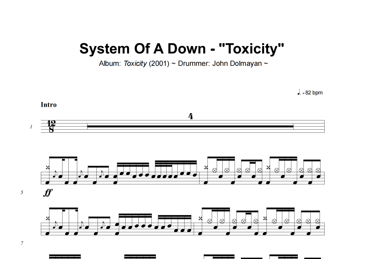 《Toxicity》是System Of A Down演唱的一首歌曲,这份架子鼓谱共有四张高清图谱,图谱由 @小虎鼓谱 编配上传,图谱使用五线谱编配,使用这份Toxicity架子鼓谱,你将能够轻松地敲打出这首System Of A Down的Toxicity,快来尝试吧。