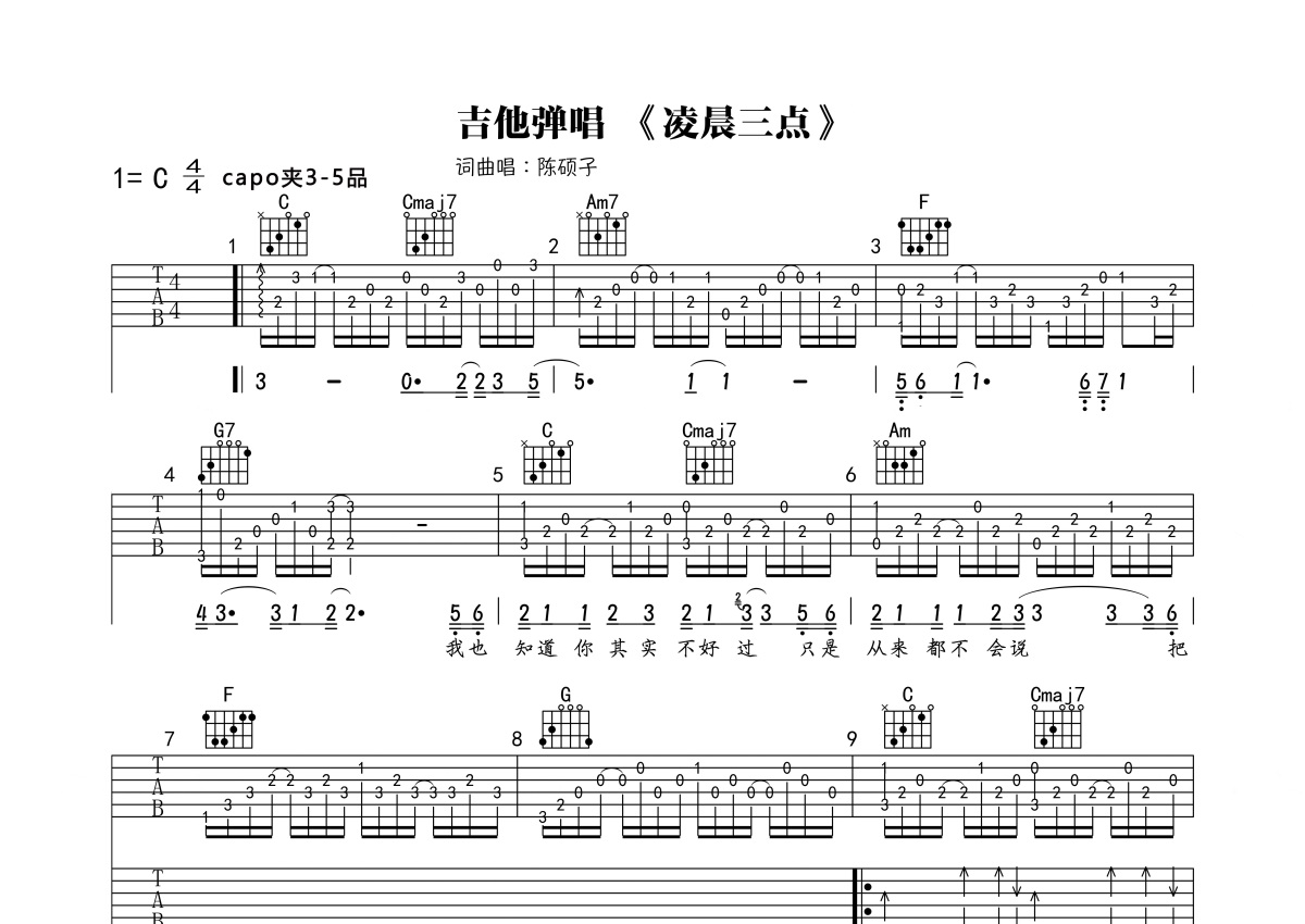 陈硕子《凌晨三点》吉他谱 - C调弹唱六线谱