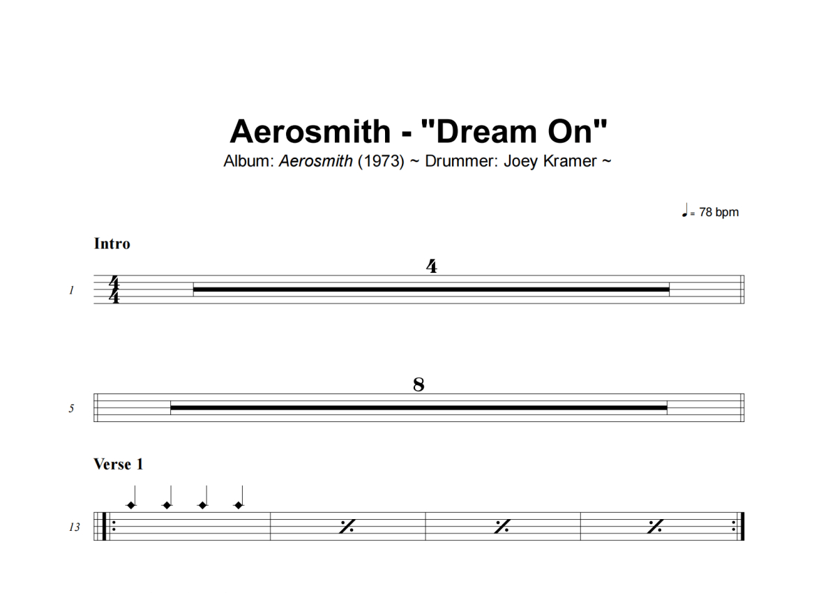 《Dream On》是Aerosmith演唱的一首歌曲,拍号为4/4拍,这份架子鼓谱共有三张高清图谱,图谱由 @小虎鼓谱 编配上传,图谱使用五线谱编配,使用这份Dream On架子鼓谱,你将能够轻松地敲打出这首Aerosmith的Dream On,快来尝试吧。