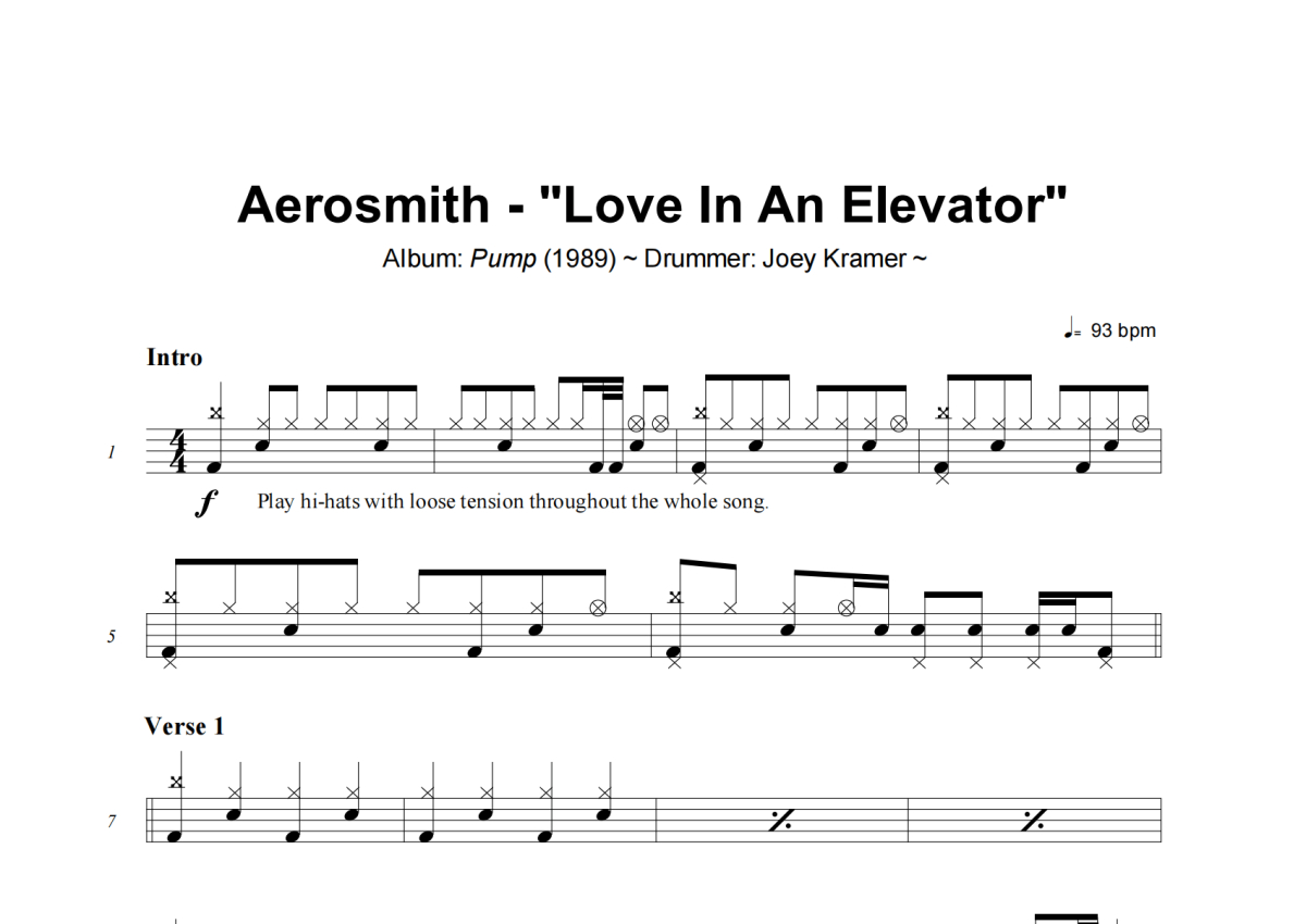 《Love In An Elevator》是Aerosmith演唱的一首歌曲,拍号为4/4拍,这份架子鼓谱共有五张高清图谱,图谱由 @小虎鼓谱 编配上传,图谱使用五线谱编配,使用这份Love In An Elevator架子鼓谱,你将能够轻松地敲打出这首Aerosmith的Love In An Elevator,快来尝试吧。